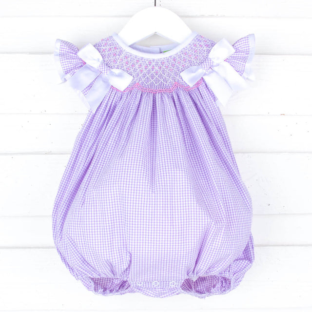This French Lavender Gingham Smocked Bow Bubble is the sweetest spring outfit. Designed from lavender gingham fabric, this bubble features delicate geometric hand-smocking and is adorned with white satin bows. It features angel-style sleeves with white tape trim, adding to its charm. Snaps in stride make dressing up your little one easy and convenient.