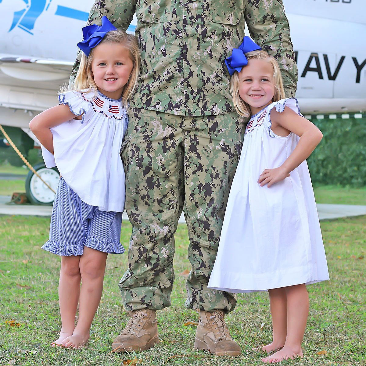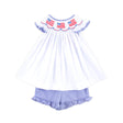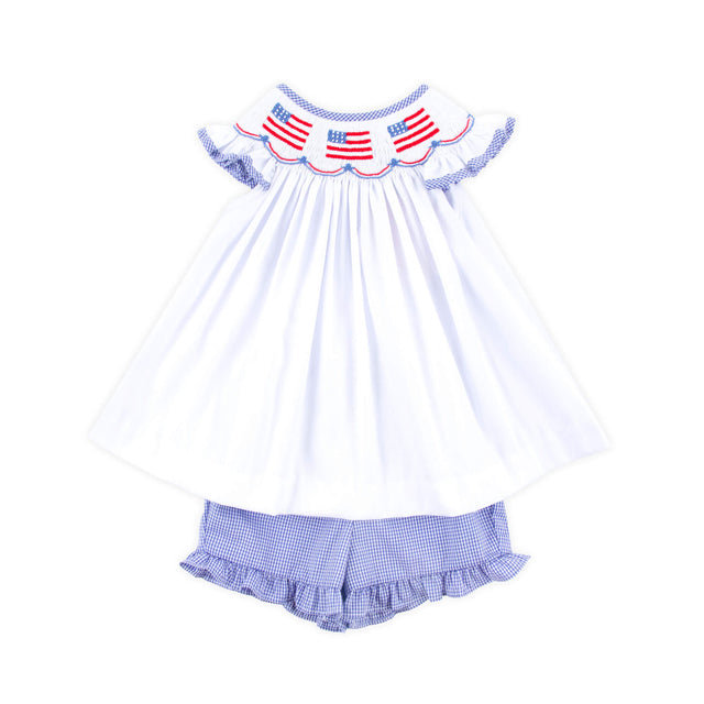 This Flag Smocked White Seersucker Short Set is ready to celebrate and honor the 4th of July in classic patriotic style. The white pique top features angel flutter sleeves with blue gingham tape trim and smocked flags for a sweet festive look. It is paired with ruffled royal gingham shorts.