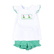 Make a stylish statement on a summer day at the course with our Golf Pin Green Gingham Short Set! The white knit top features charming hand-smocked golf pins, perfectly paired with green gingham waistband shorts for a classic and sporty look.
