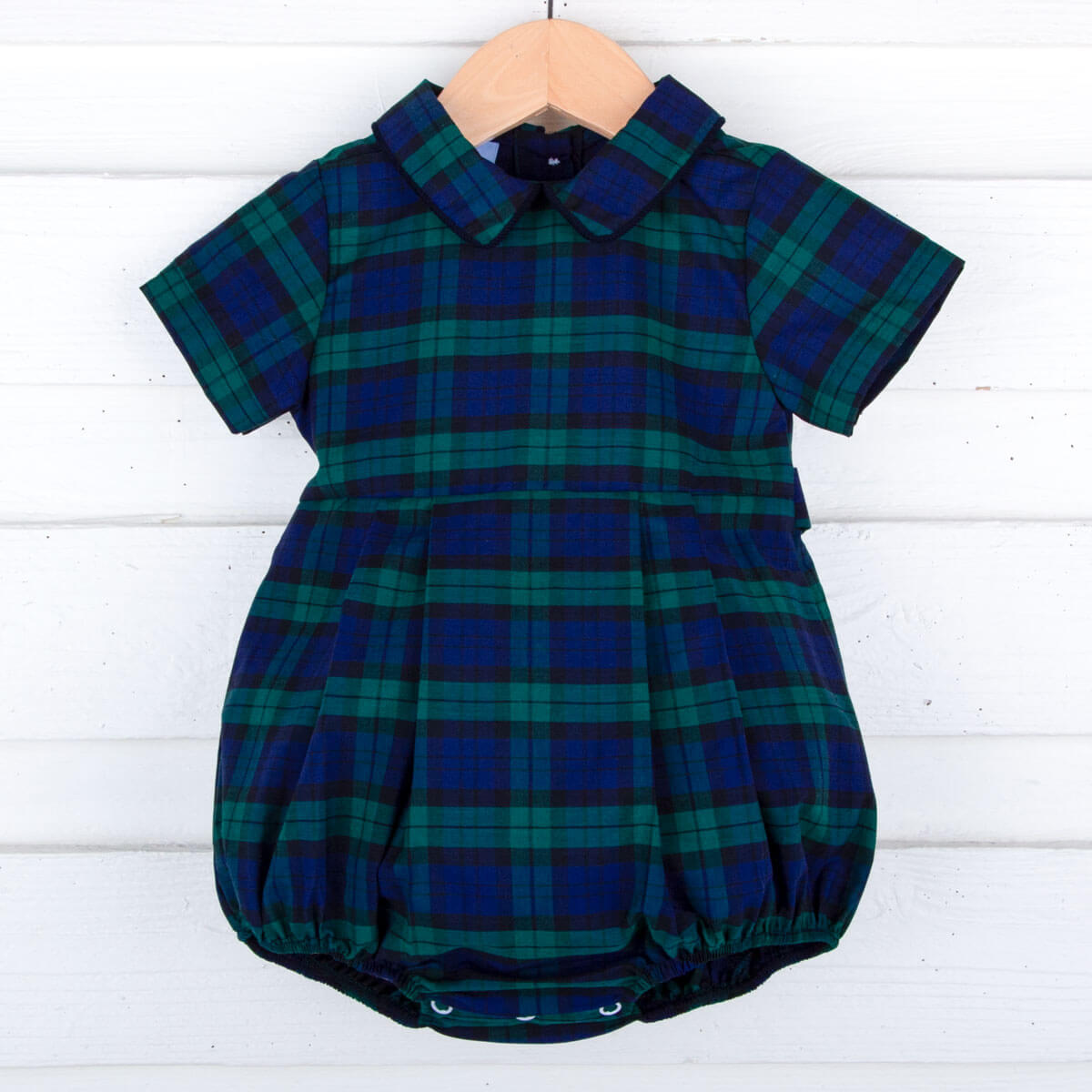 Make sure your little one is picture-perfect for Christmas or Thanksgiving in our Hamilton Plaid Navy & Green Collared Bubble! This classic navy and green plaid bubble features an elegant collar, making it perfect for family photos during the holidays. Snaps in the stride ensure easy changes. Add a monogram to personalize his holiday look!