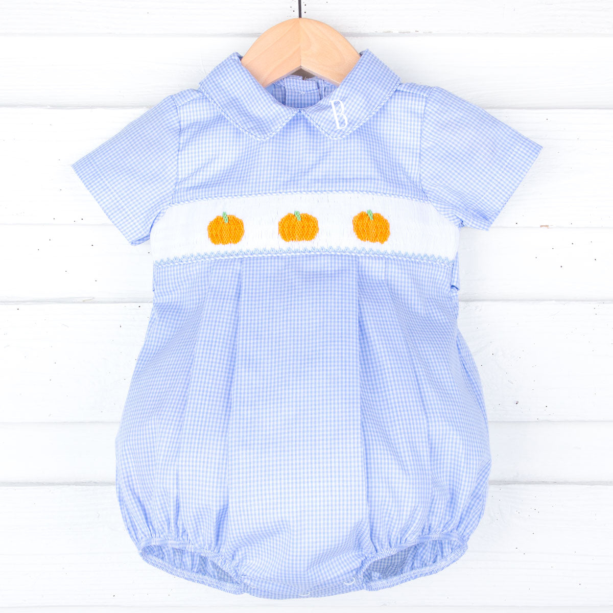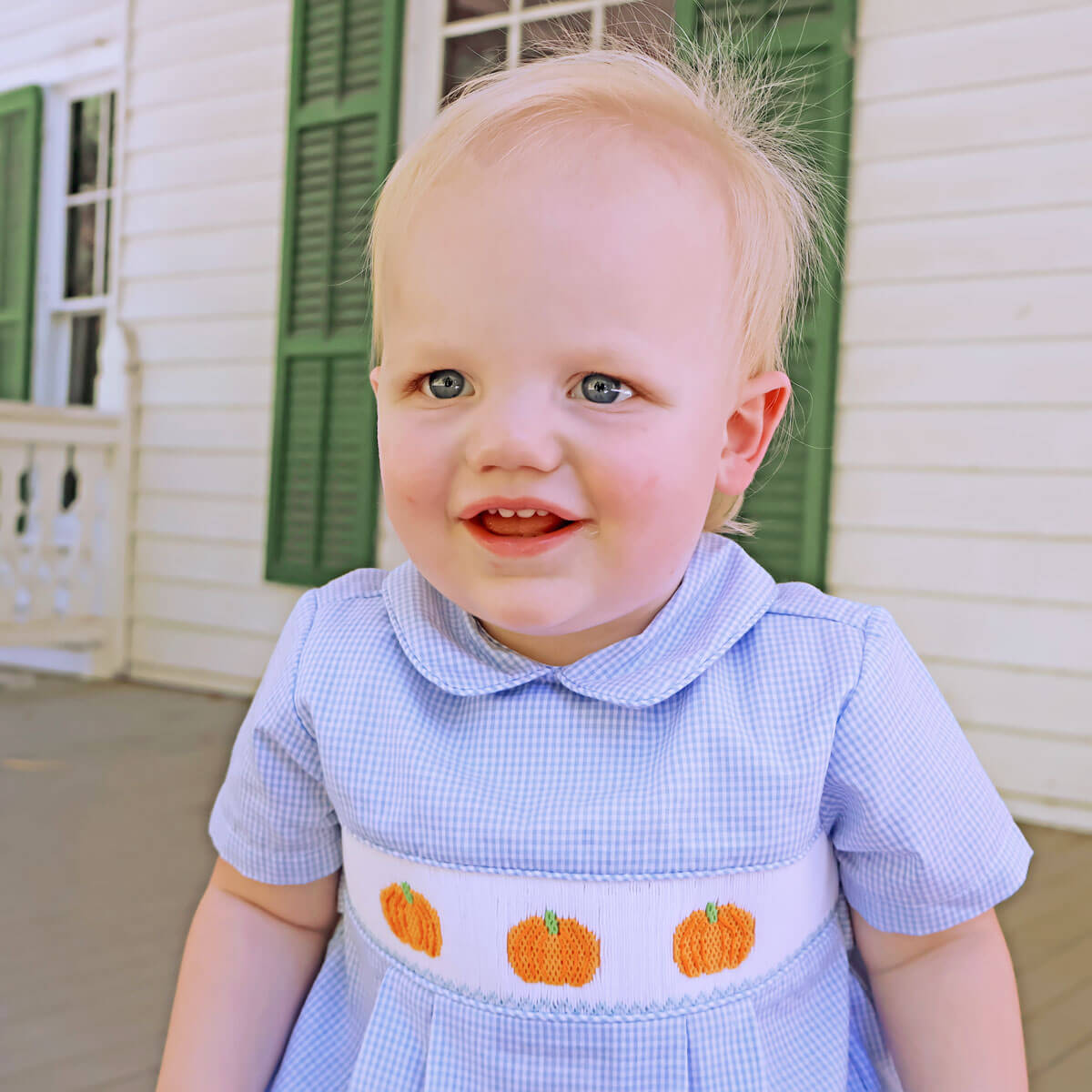 Get ready for fall fun with our Harvest Pumpkin Smocked Light Blue Gingham Collared Bubble! This stylish and picture-perfect outfit is ideal for any autumn activities and holidays. The collared bubble in light blue gingham features beautiful smocked pumpkins that will make your little one stand out. Snaps in stride for easy changes.