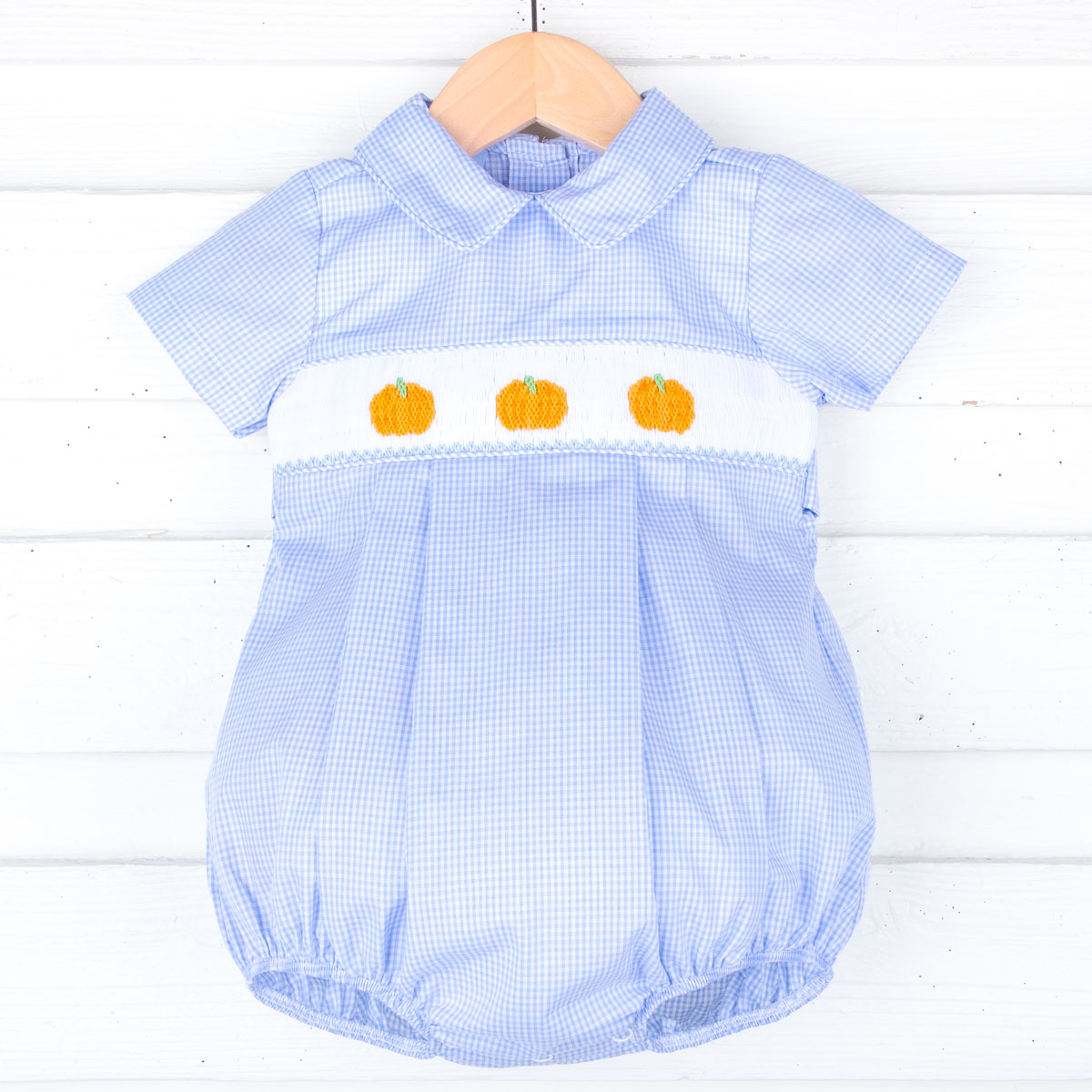 Harvest Pumpkin Smocked Light Blue Gingham Collared Bubble
