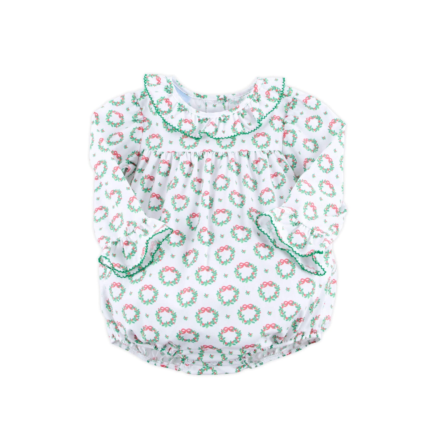 Celebrate Christmas in our Holiday Wreath White Print Ruffle Collared Bubble. This charming bubble features a Christmas wreath print, a ruffle collar and long sleeves with red ric rac trim, making it perfect for the festive season. With snaps in stride for easy changing!