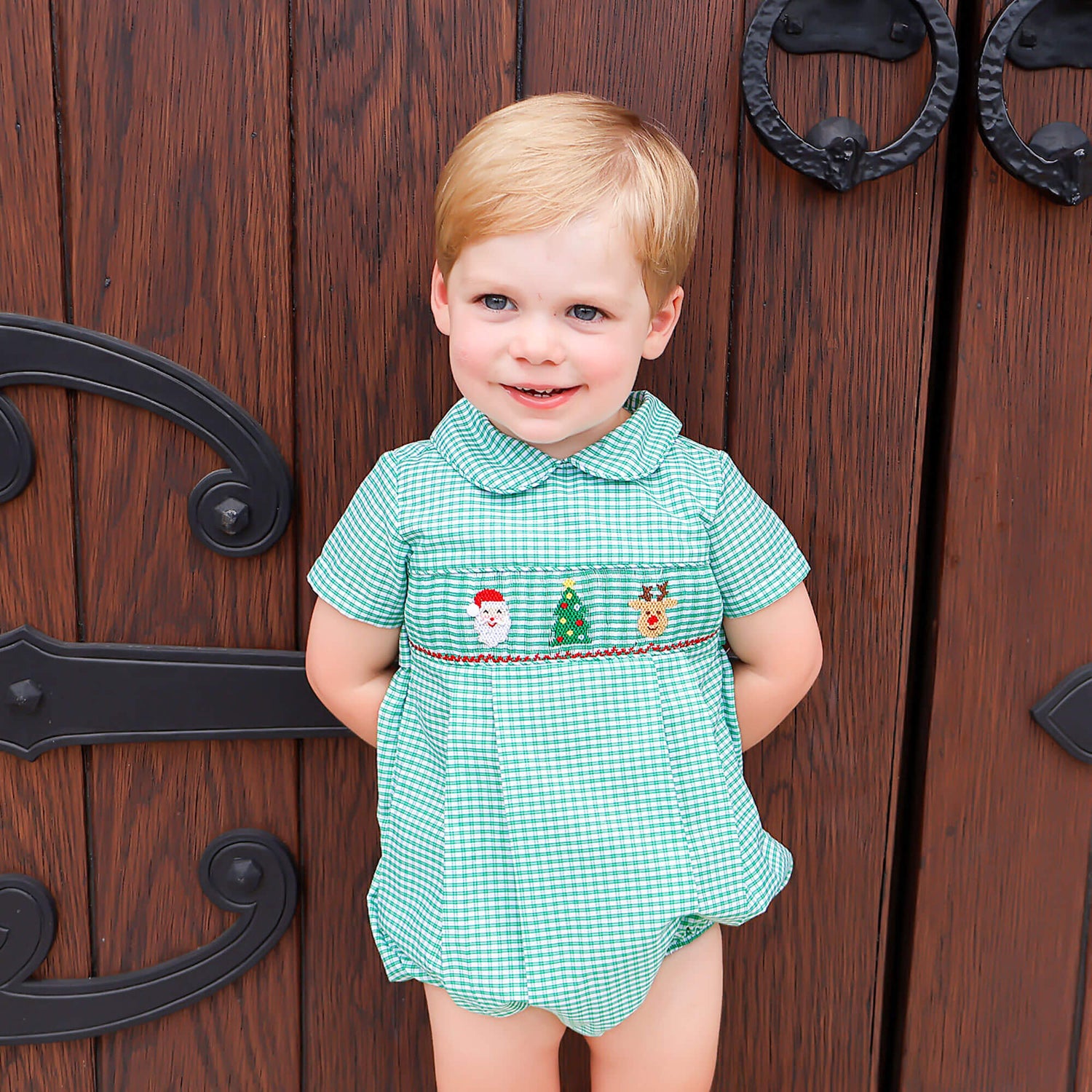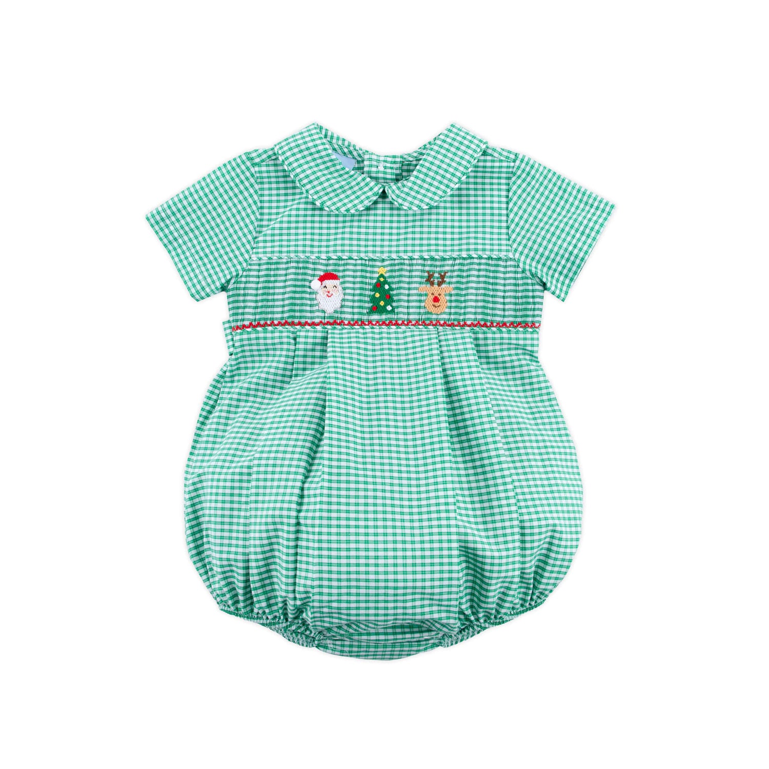 Prepare your little one for the holiday season with this Jolly Christmas Smocked Green Windowpane Collared Bubble. This green windowpane bubble features a cute collar, smocked Santa, Christmas tree, and reindeer with snaps in stride for easy changing.