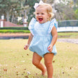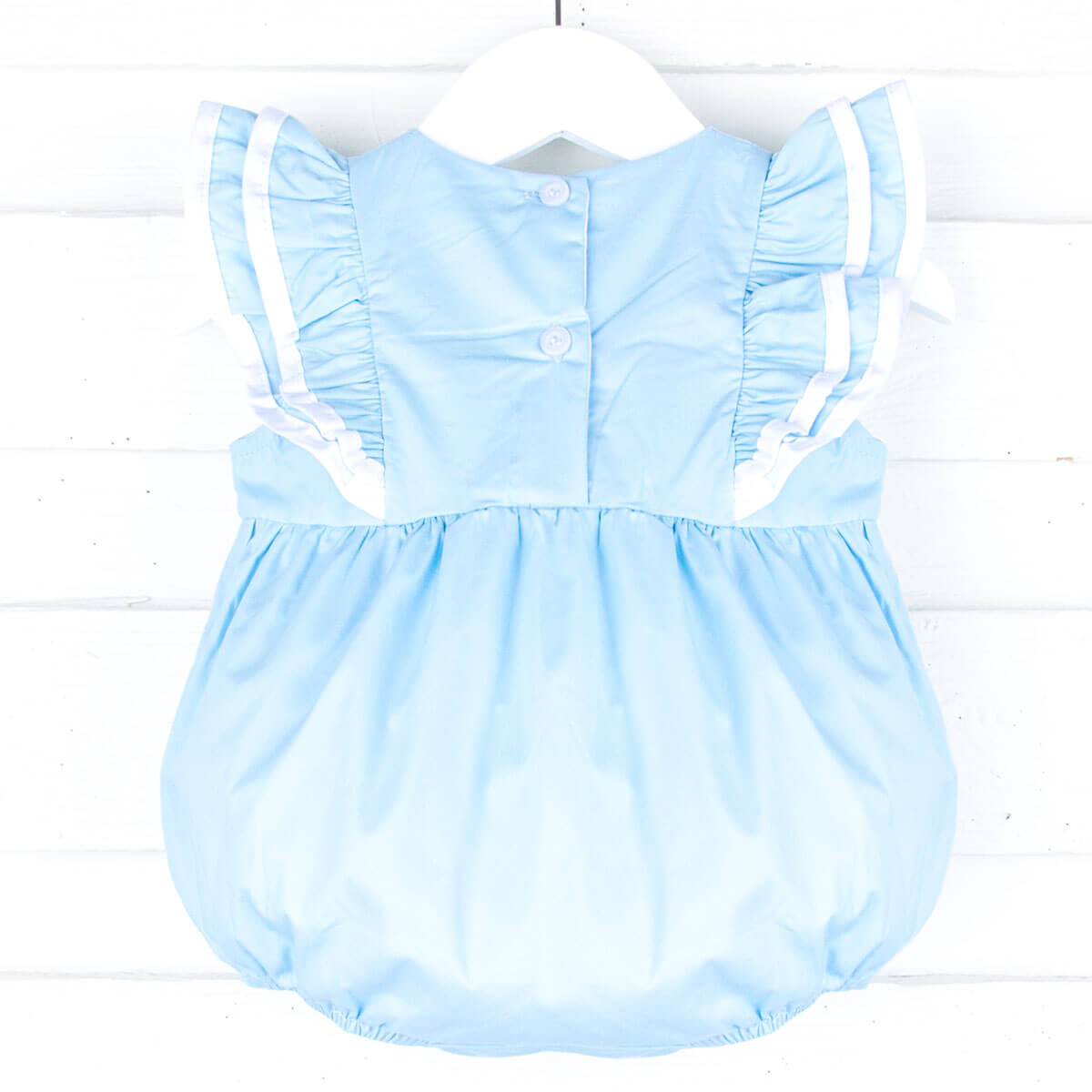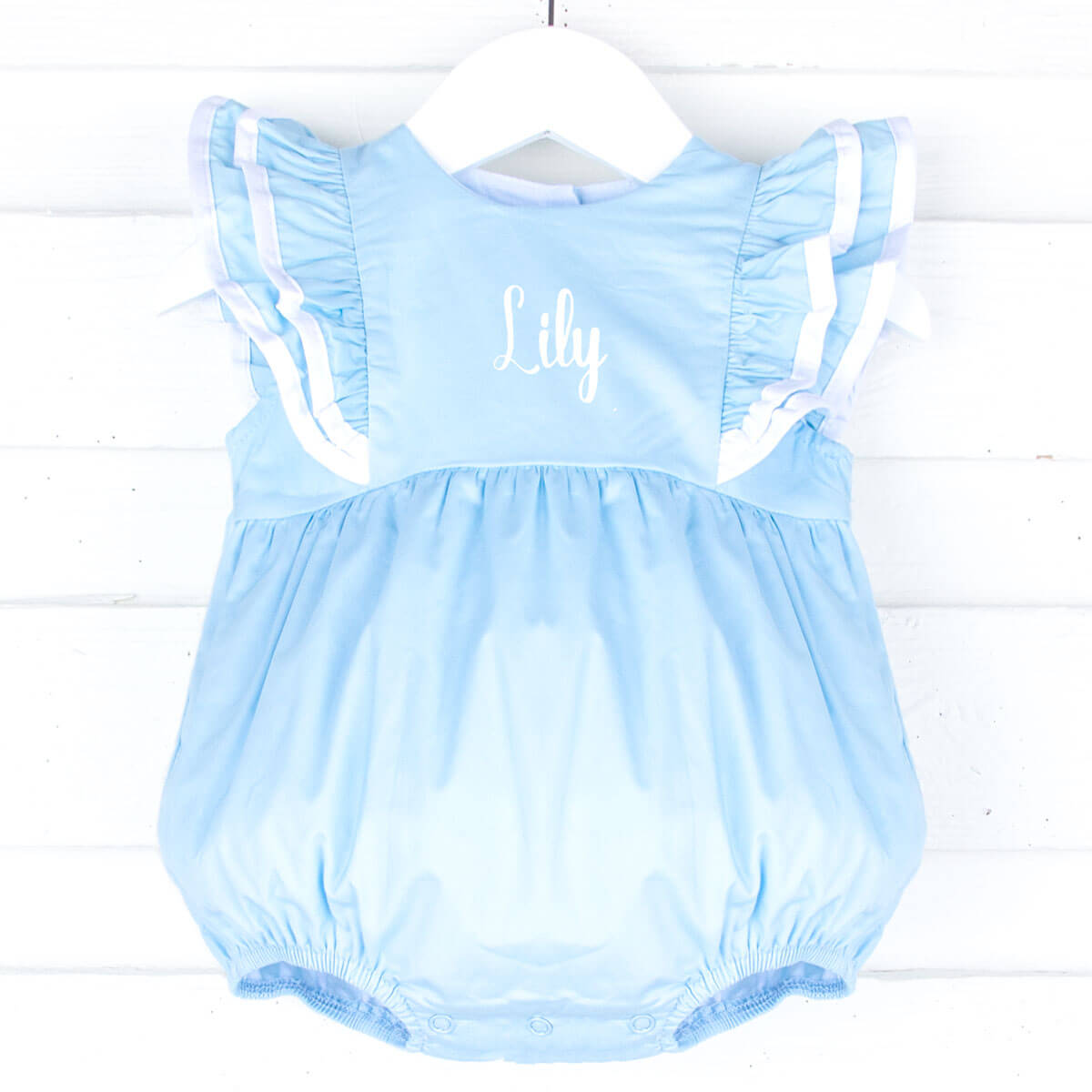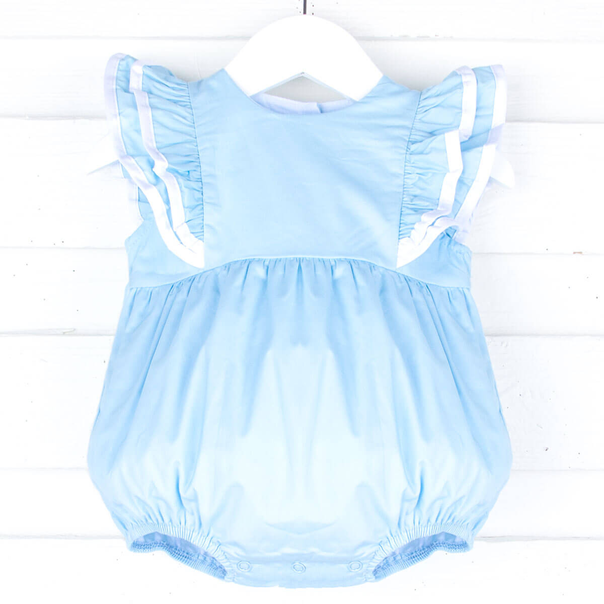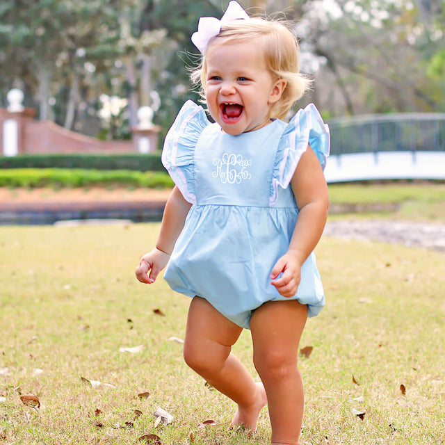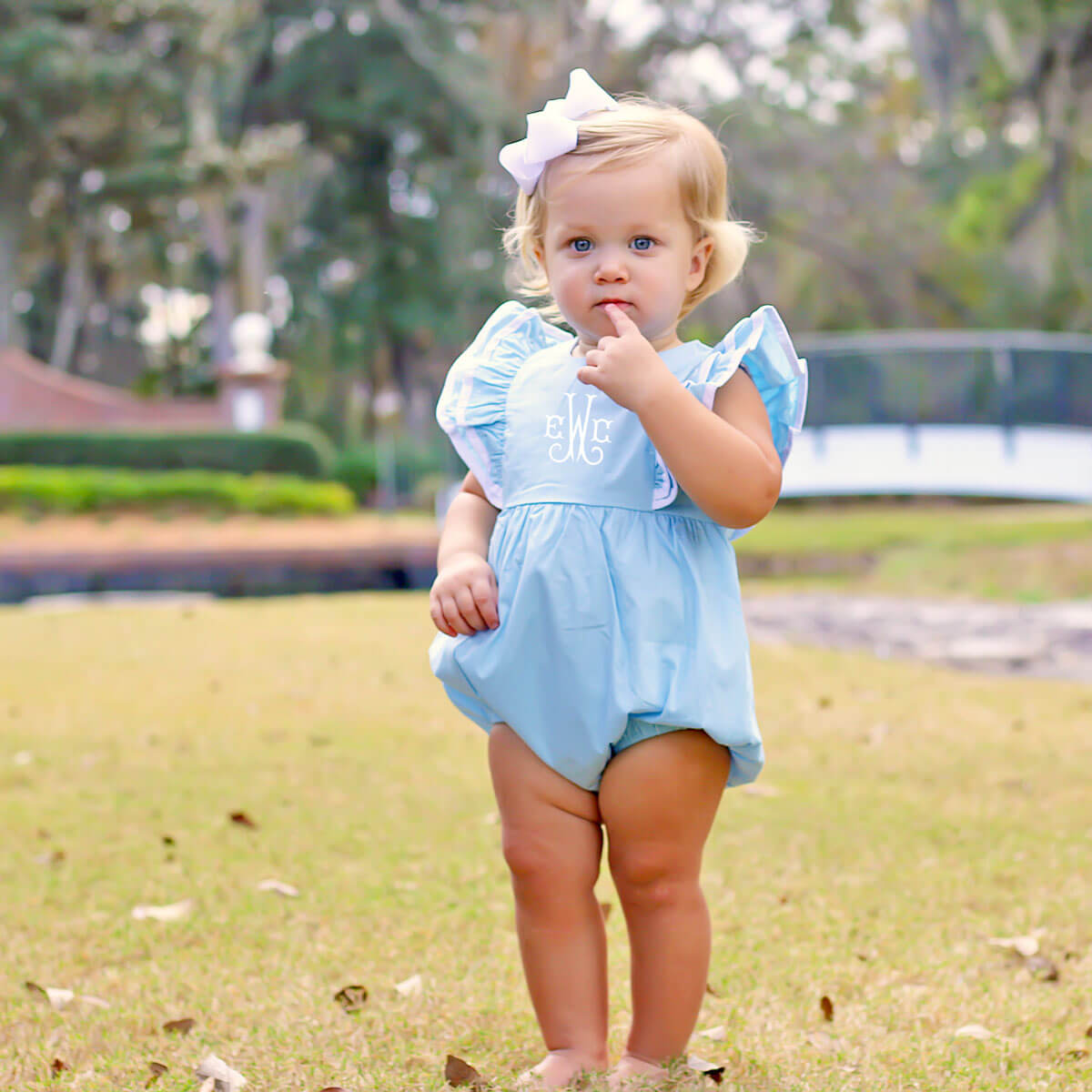 Elevate your little one's spring and summer wardrobe with our enchanting Light Blue Alice Bubble. This delightful Alice-style bubble is not only perfect for any special occasion but also adds a touch of charm to everyday moments. Designed from a solid blue fabric, the bubble features intricately designed ruffles adorned with white tape trim, creating a whimsical and stylish look. With the convenience of snaps in stride, dressing up becomes a breeze for your little one. To make this outfit truly unique, add a monogram for a personalized touch, ensuring your little one stands out with grace and elegance at every event.