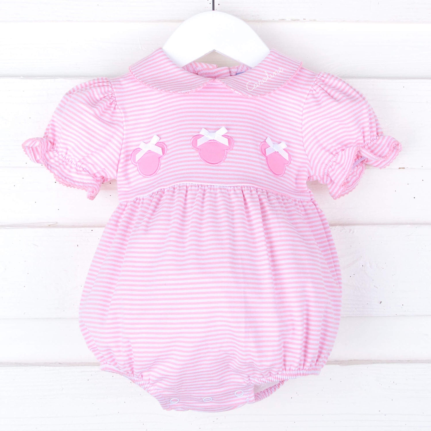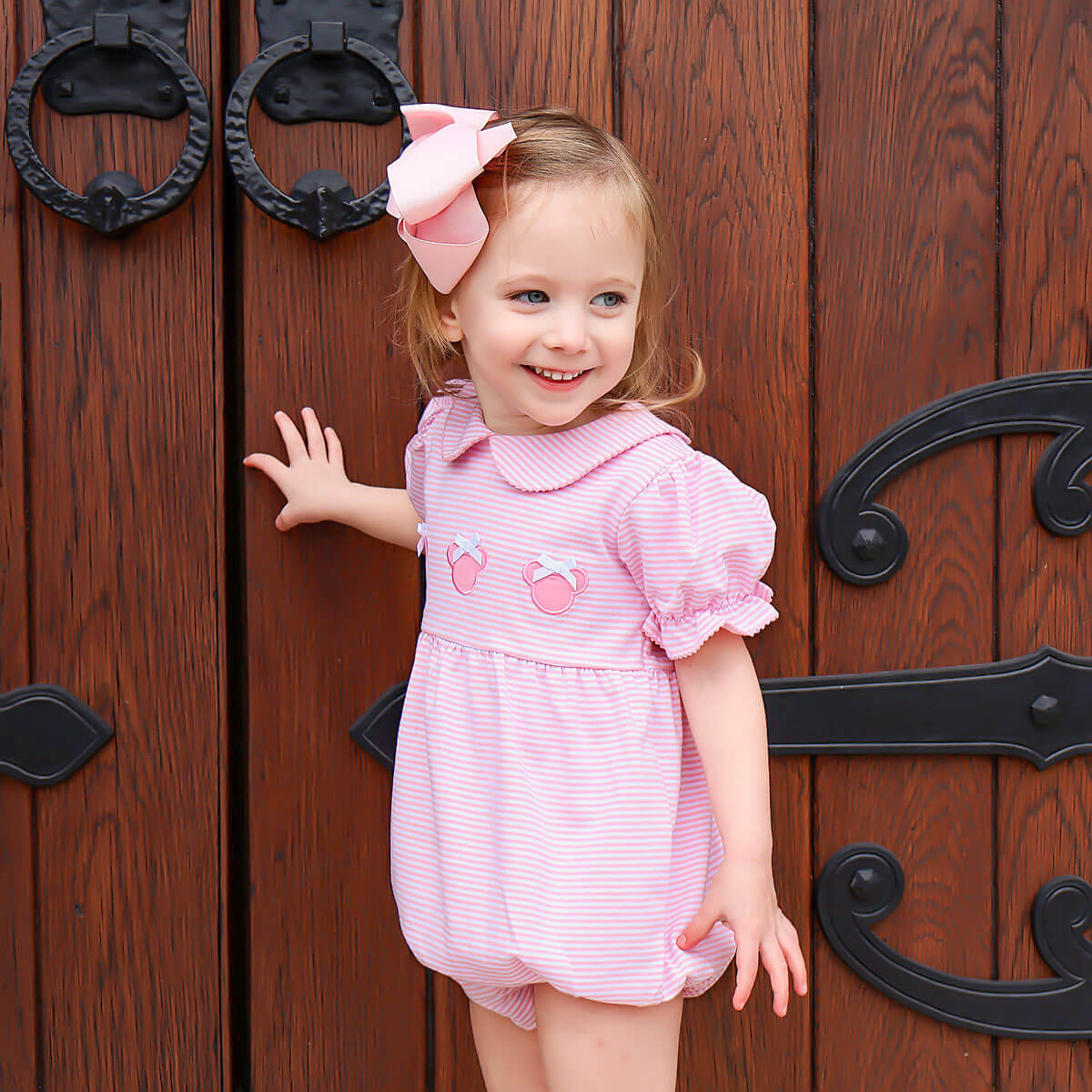 One of our most magical designs! This Mouse Ears Pink Stripe Riley Bubble is perfect for theme park adventures, birthday celebrations, and playtime fun. The pink knit stripe Riley bubble features a ruffle hem, a Peter Pan collar with pink picot trim, and an adorable mouse ears applique, with snaps along the stride for easy changes. Add a monogram to the collar to make it uniquely adorable. This bubble is a charming choice for any special day!