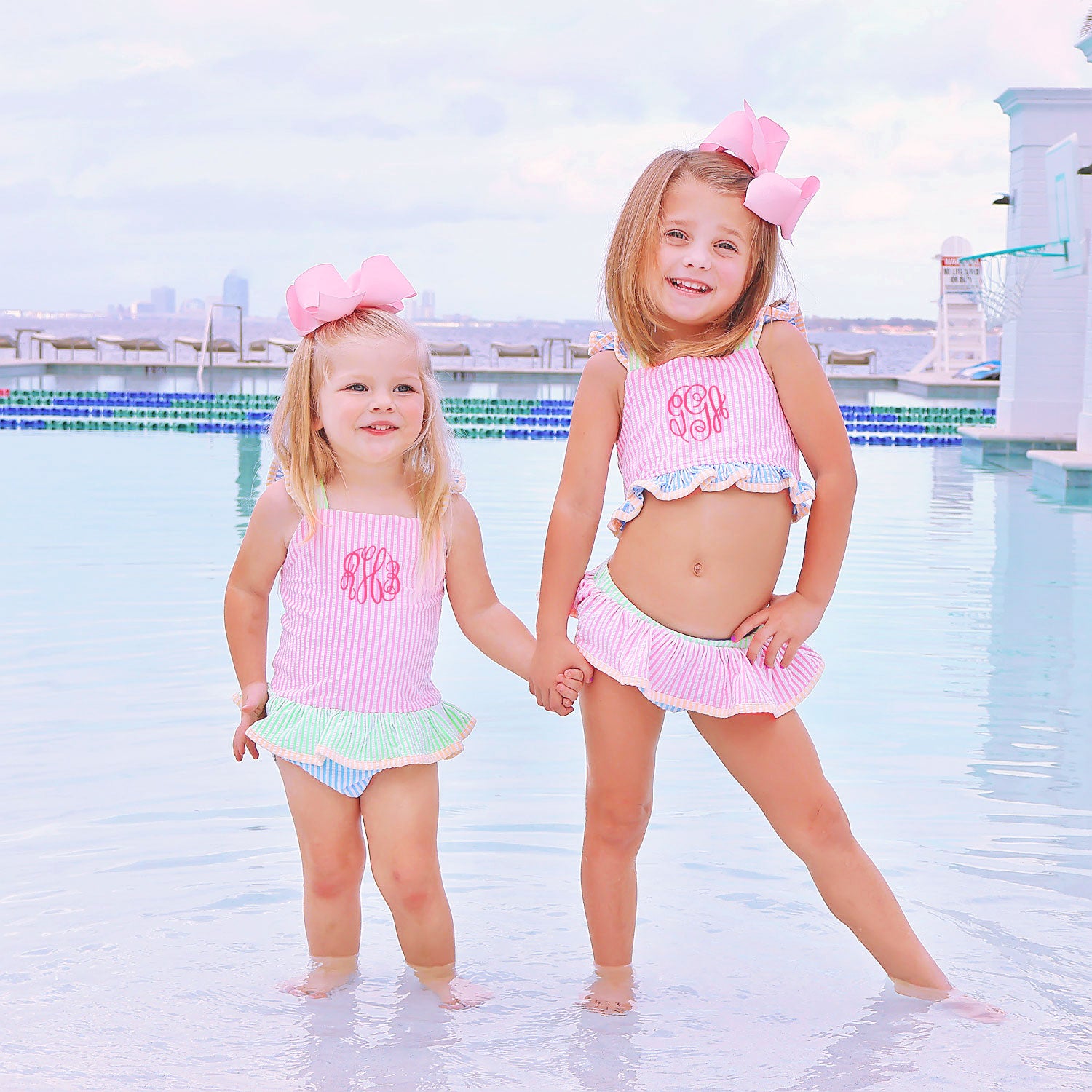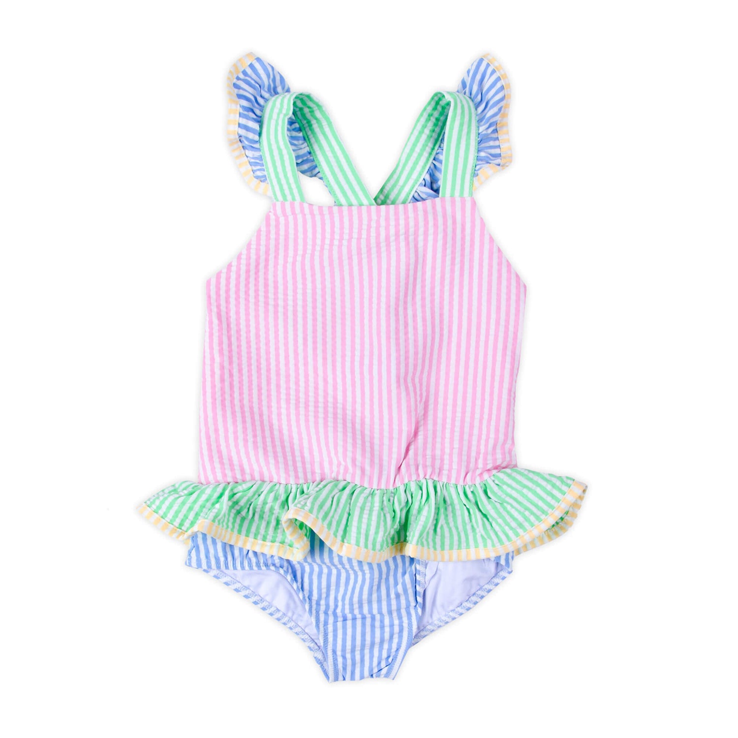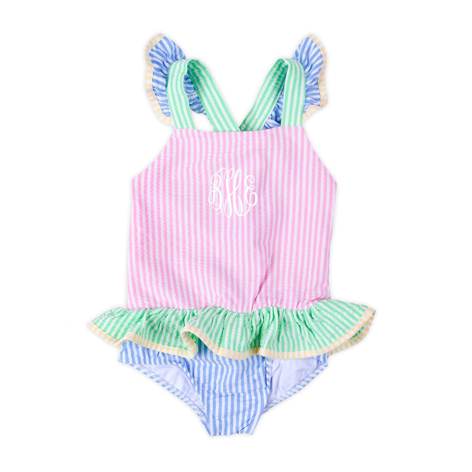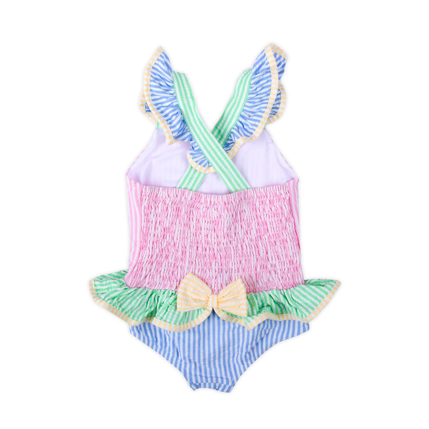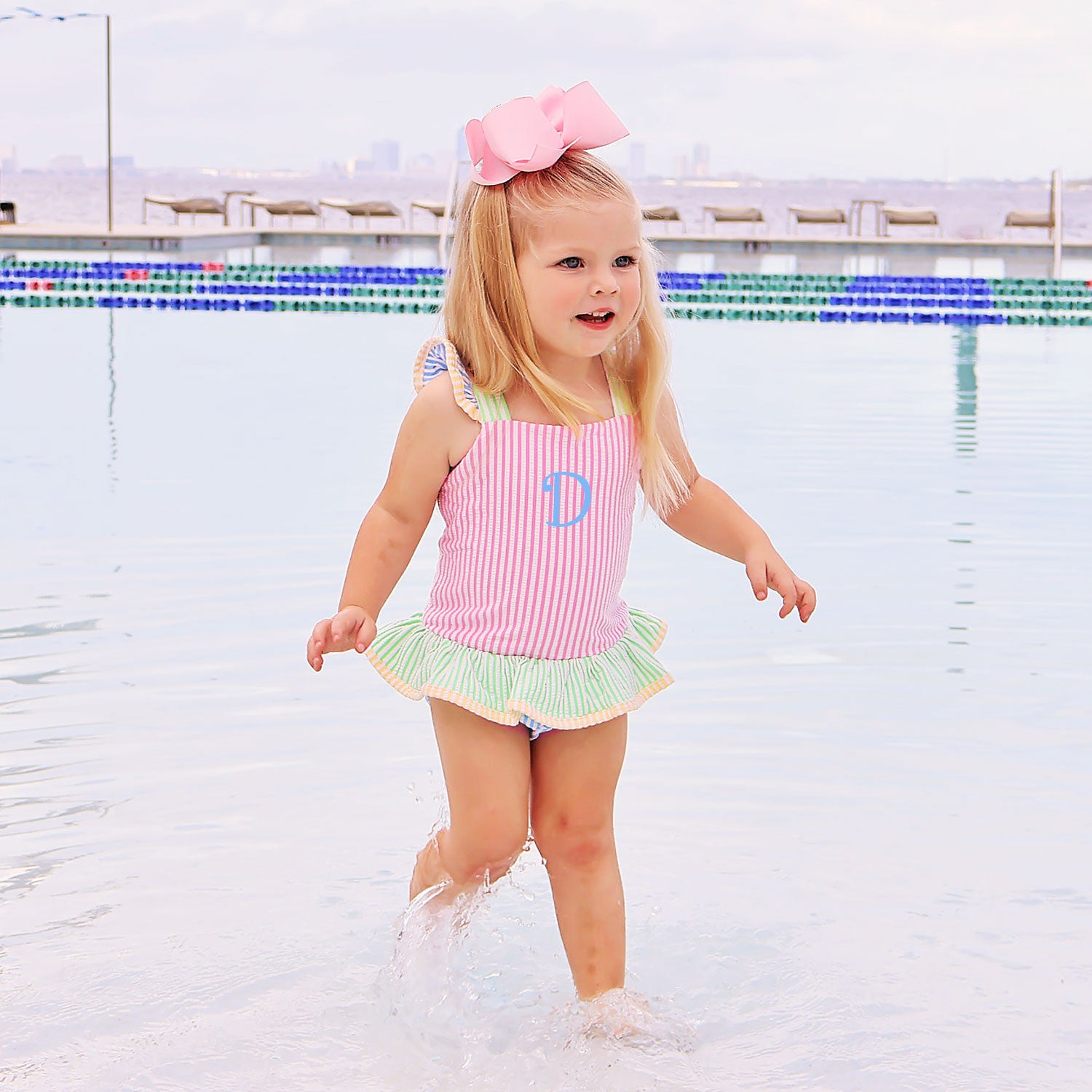 Get ready for a family vacation or poolside fun with our Colorblock Seersucker Stripe One-Piece Swimsuit! Featuring vibrant multi-colored seersucker stripes, this swimsuit is both stylish and practical. A sweet yellow bow on the back adds an extra adorable touch, while UPF 50 protection keeps your little one safe in the sun. Personalize it with a monogram for a special touch that makes it uniquely theirs. Perfect for creating sunny memories!