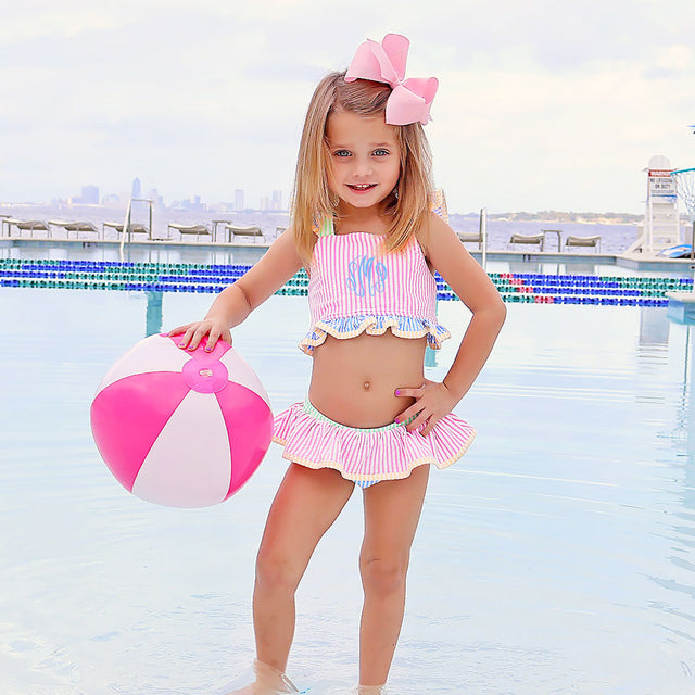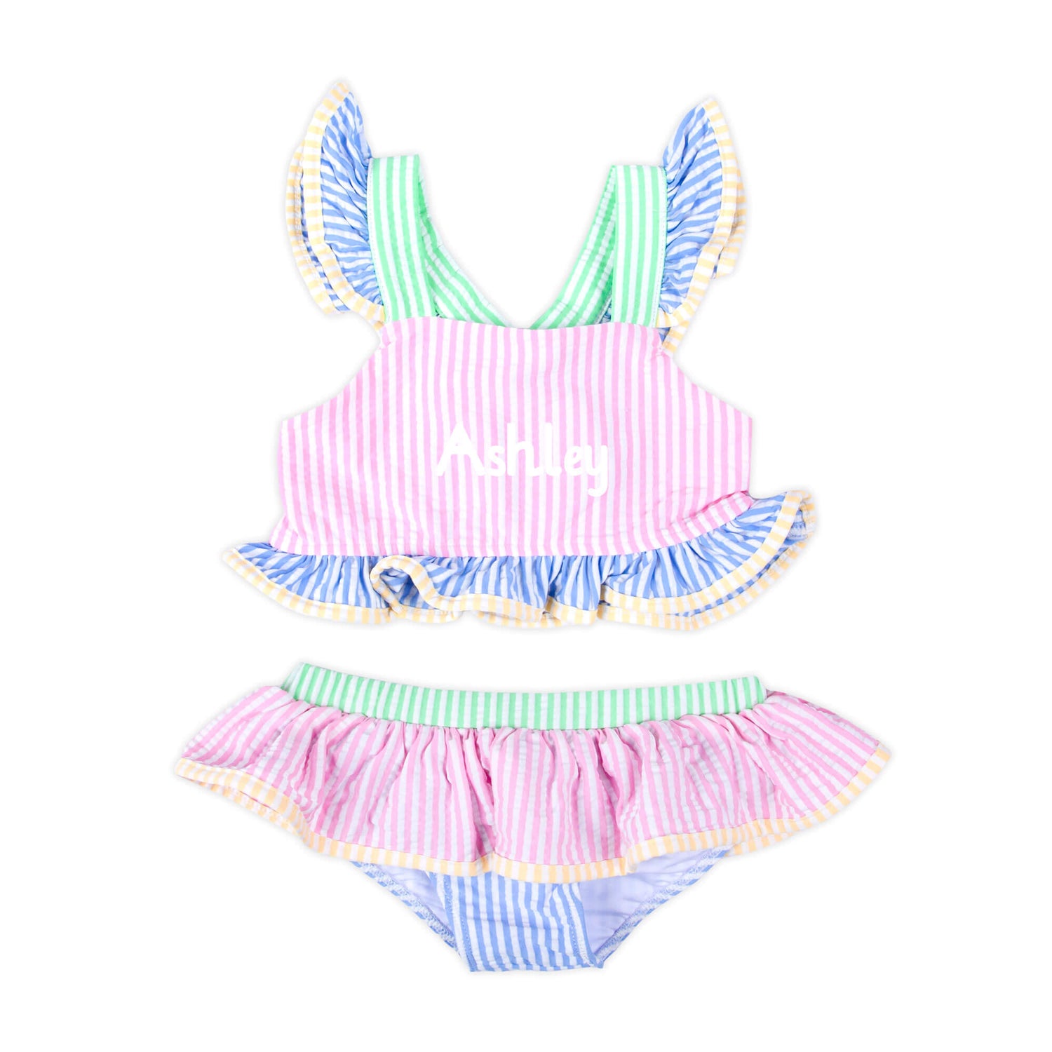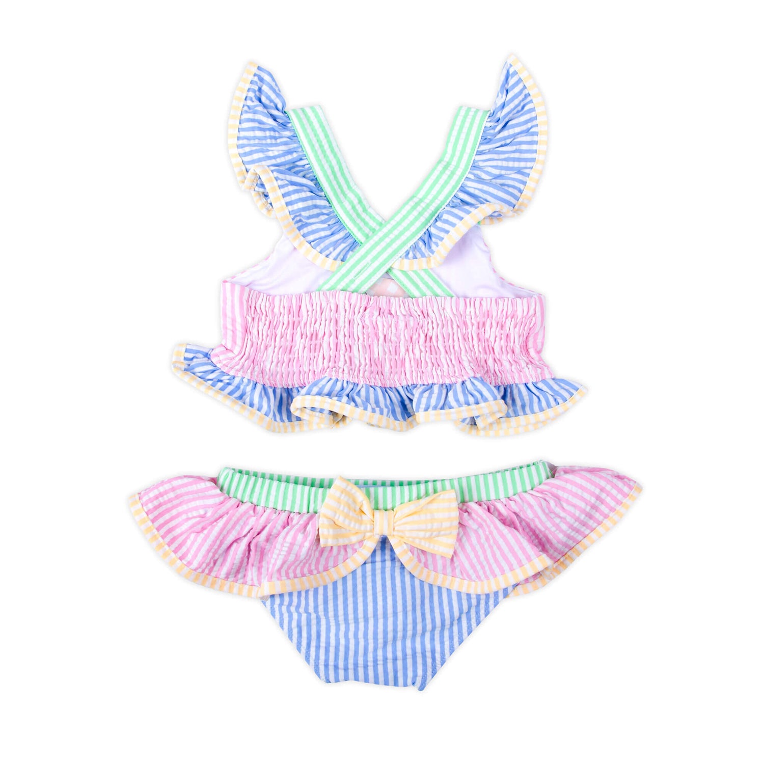 Get ready for a family vacation or poolside fun with our Colorblock Seersucker Stripe Two Piece Swimsuit! Featuring vibrant multi-colored seersucker stripes, this swimsuit is both stylish and practical. A cute peplum and a sweet yellow bow on the back add an extra adorable touch, while UPF 50 protection keeps your little one safe in the sun. Personalize it with a monogram for a special touch that makes it uniquely theirs. Perfect for creating sunny memories!