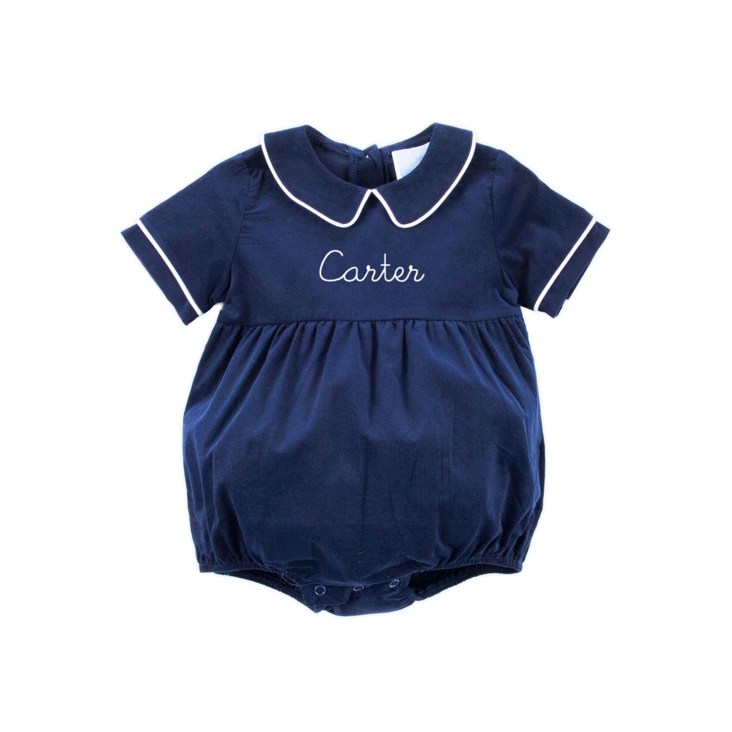 This Corduroy Collared Bubble is perfect for Christmas gatherings. This festive corduroy bubble features an elegant collar and short sleeves with white piping trim, making it perfect for visits to Santa and hanging ornaments on the tree. A timeless choice for your holiday celebrations! Convenient snaps in the stride ensure easy changes. Add a monogram to make this outfit even more special.