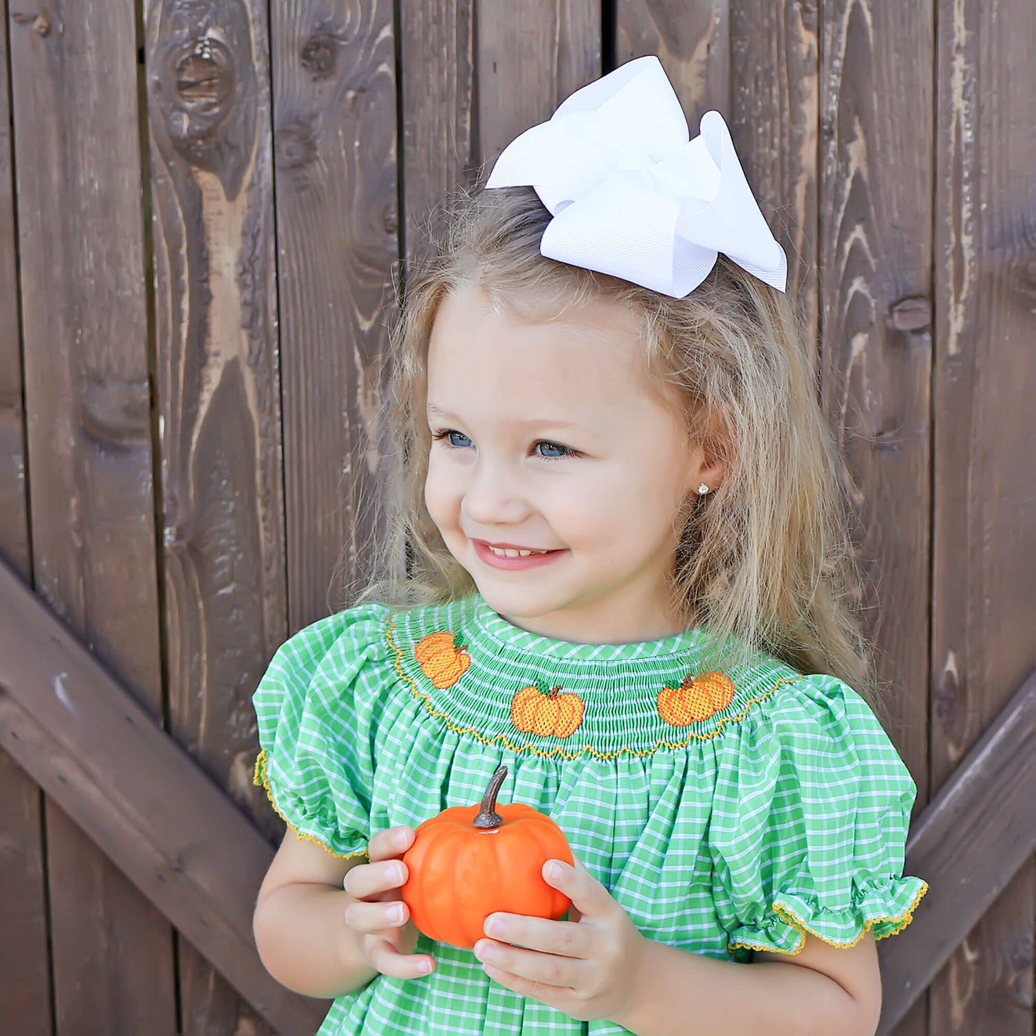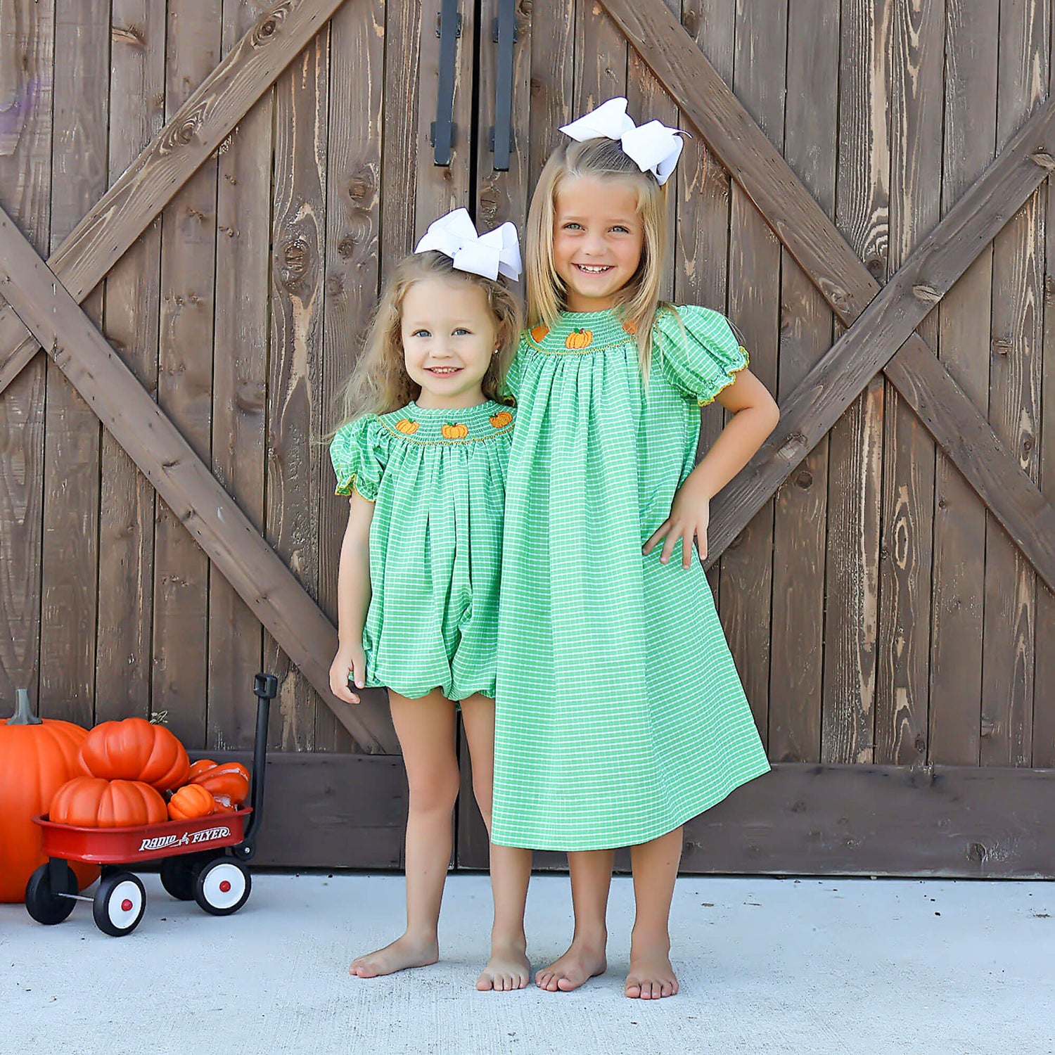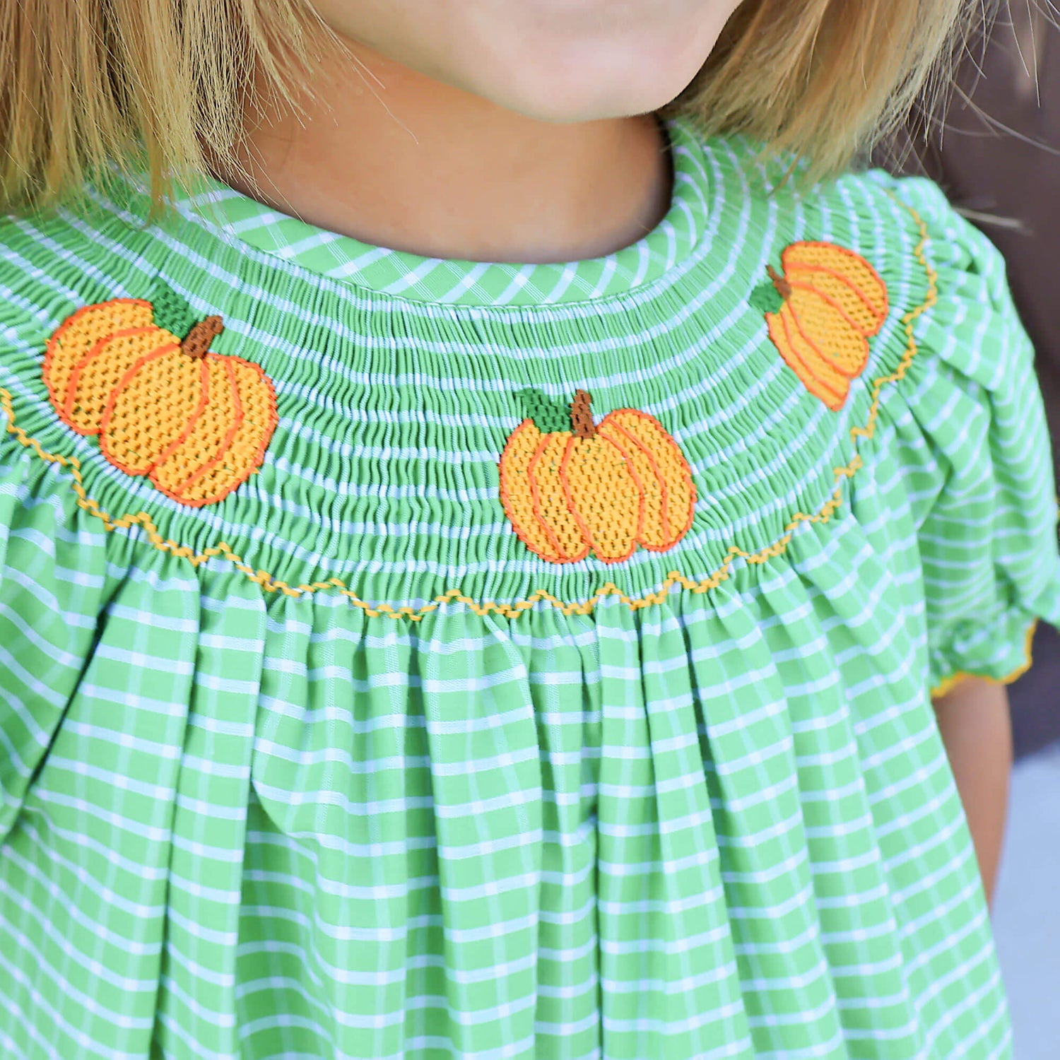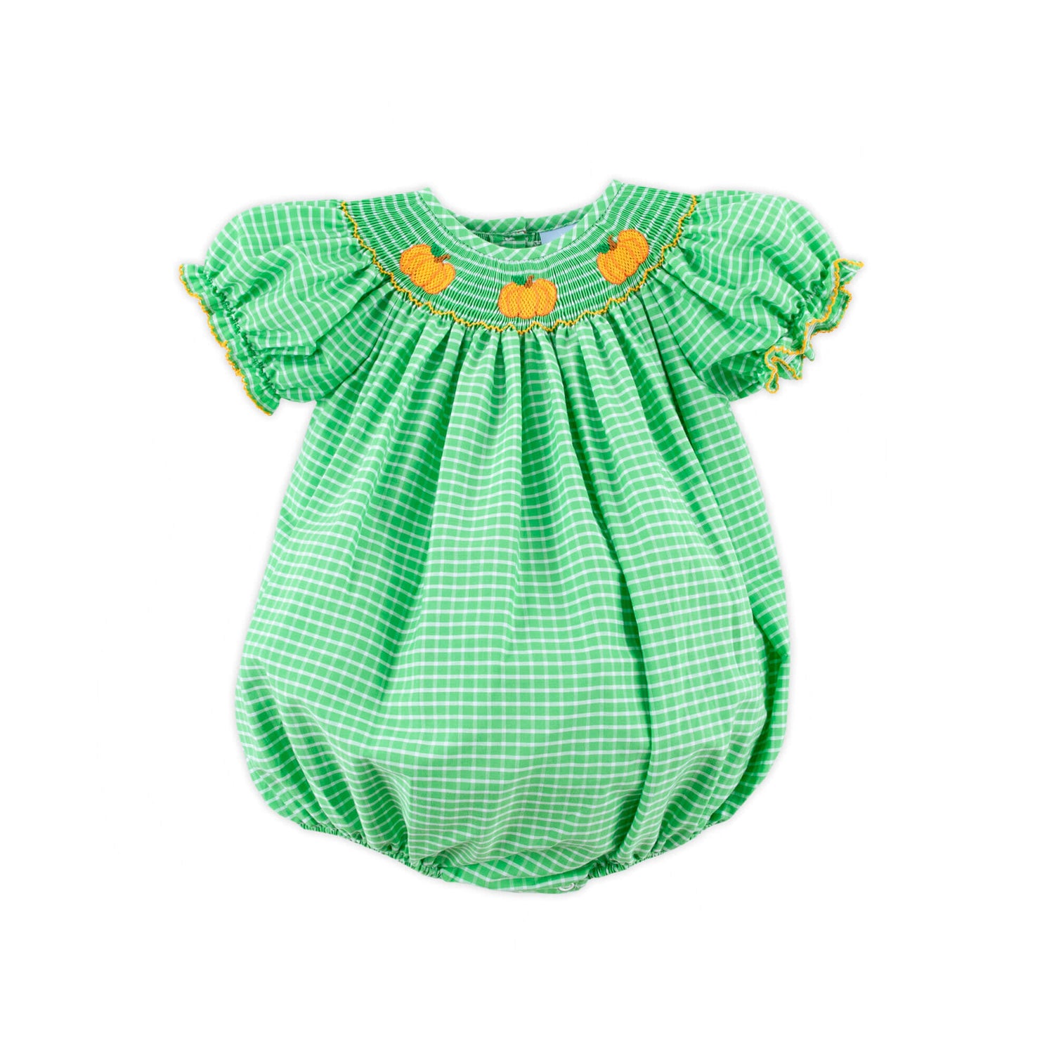 Pumpkin season is here, and your little one will be ready for all the fall fun in our Paradise Pumpkin Smocked Green Windowpane Bishop Bubble! Featuring sweet smocked pumpkins and darling bishop sleeves trimmed with orange picot, this bubble is perfect for pumpkin patch adventures and festive photo ops. Snaps in the stride make changes quick and easy!
