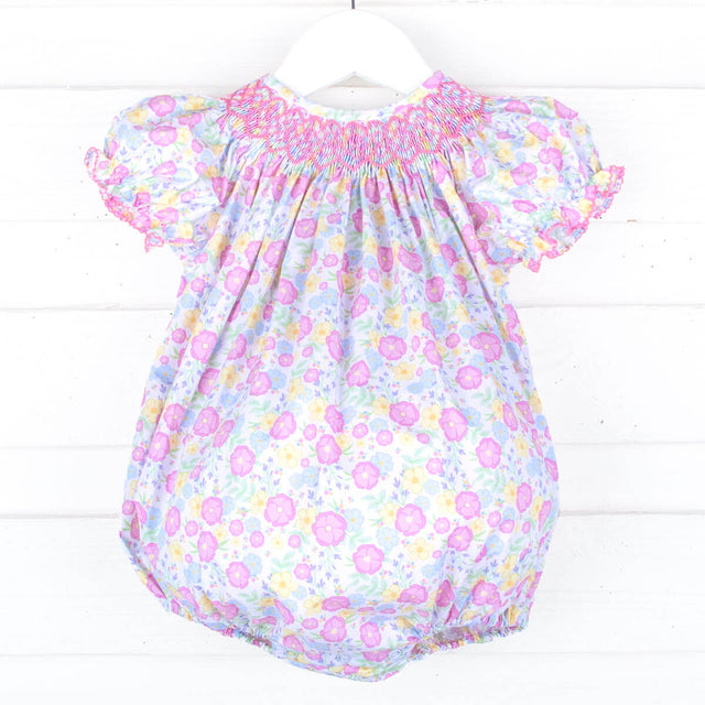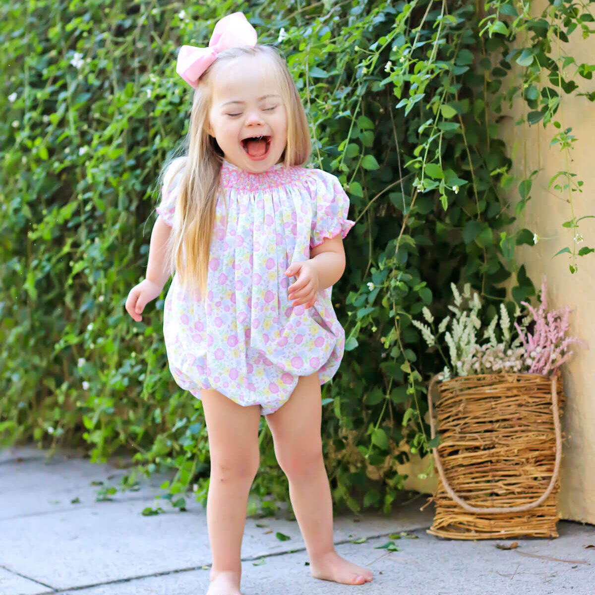 As spring unfolds, let your little one bloom with joy in our Peony Bloom Smocked Bubble. Embracing the beauty of spring, this delightful dress features a charming floral print, complemented by a lovely geometric smocking. The bubble is adorned with graceful bishop sleeves, featuring dainty pink picot trim that adds an extra touch of sweetness. Also, provides easy convenience with snaps in stride. It's the perfect outfit for your little one to twirl and play, capturing the essence of the blooming season in every detail.