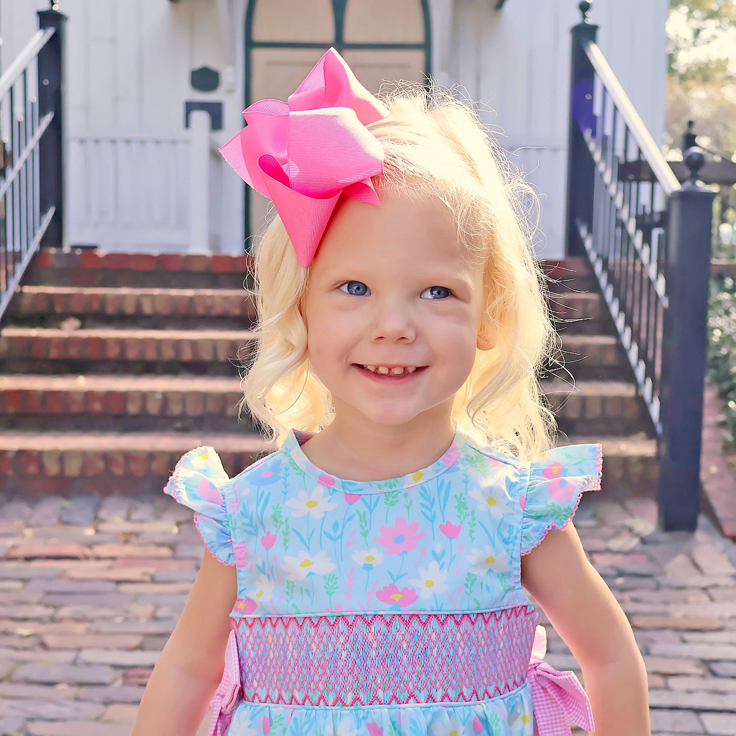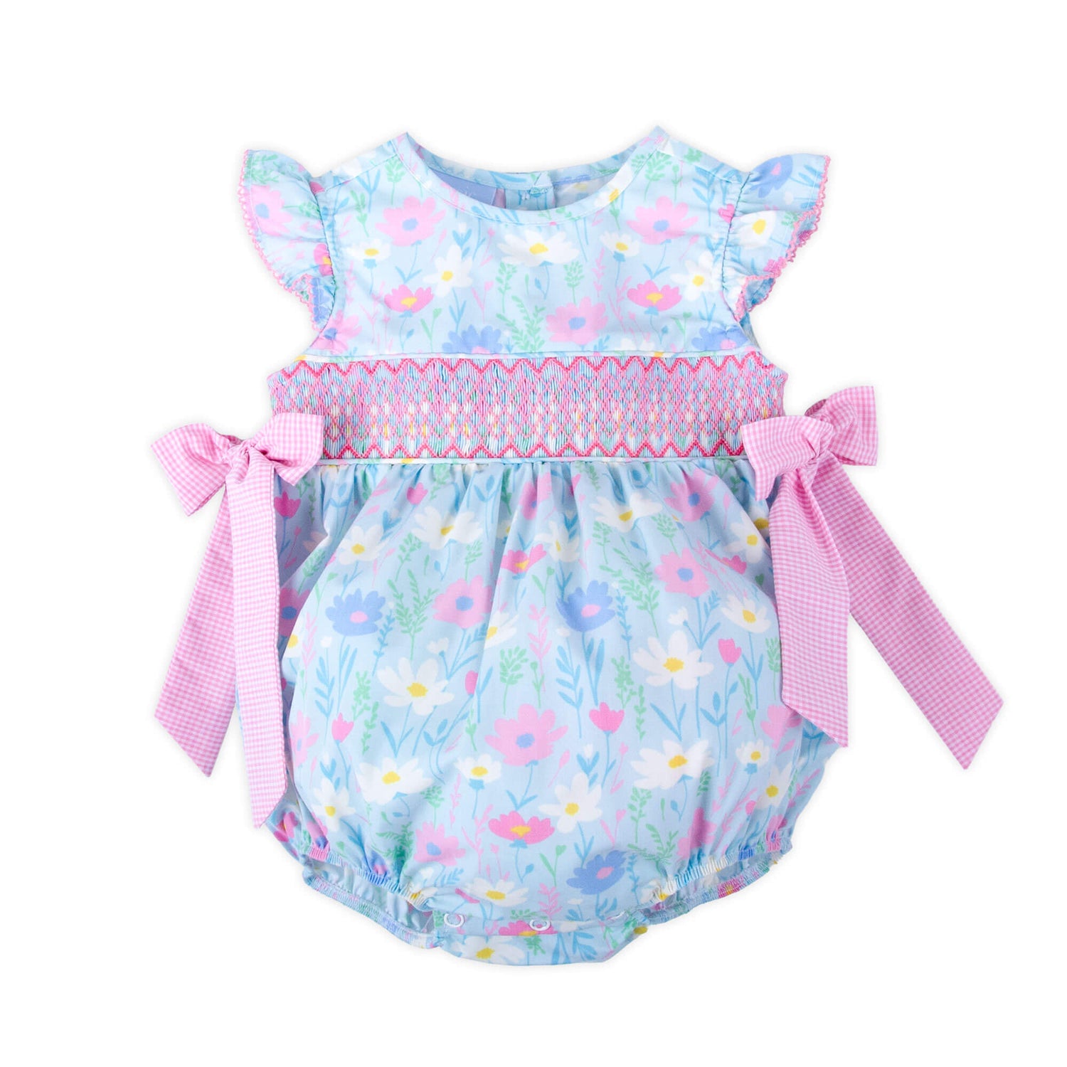 Celebrate Easter and springtime in the most charming way with our Petunia Floral Geo Smocked Beverly Bubble. This delightful Beverly style bubble features a blue and pink floral print, perfect for any spring occasion. Designed with sweet geometric smocking and pink gingham side tie bows, it adds an extra touch of grace to your little girl’s wardrobe. Designed with snaps in the stride for easy changes, it’s ideal for twirling at family gatherings or Easter celebrations!