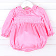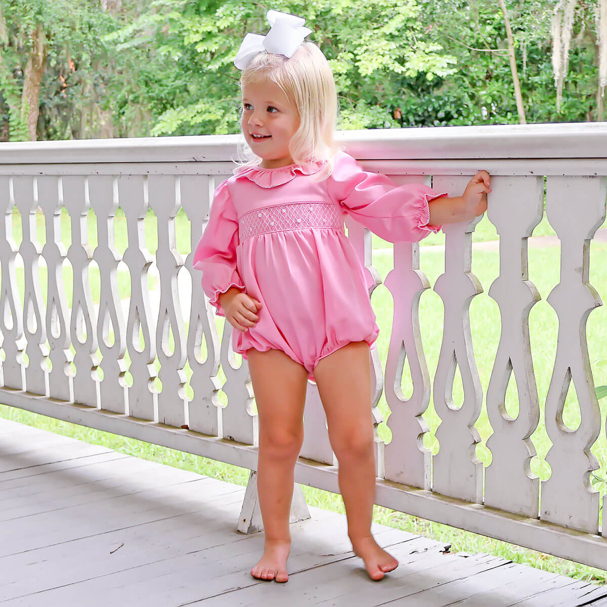 Your little one will be stylish this fall in our Pink Pique Pearl Smocked Amber Bubble! This gorgeous pink pique bubble features beautiful geometric smocking with pearl details. Designed with a ruffle scalloped collar and long sleeves, it’s perfect for any occasion. Includes stride snaps for effortless changes.