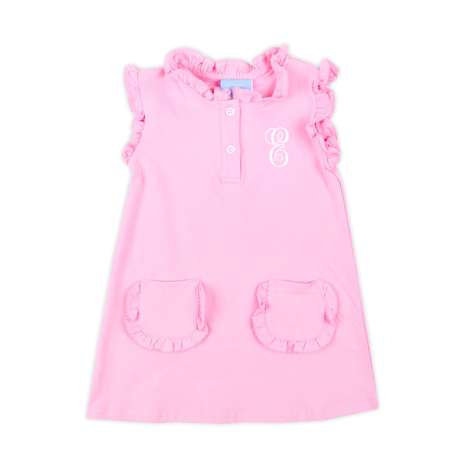 Elevate playtime with our Pink Nicole Dress! This Nicole-style dress features delightful ruffle trim, front buttons, and two cute ruffle pockets. Complete the look with a cute monogram for an extra touch of charm. It's the perfect outfit for playtime.