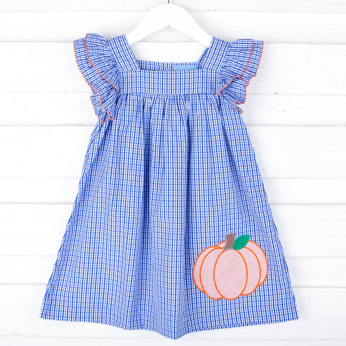 Enjoy the fall season in our Pumpkin Cutie Royal Blue Gingham Poppy Dress. This adorable Poppy-style dress features a large pumpkin applique on the bottom. It’s designed with double ruffle sleeves, making it extra cute.