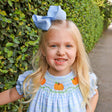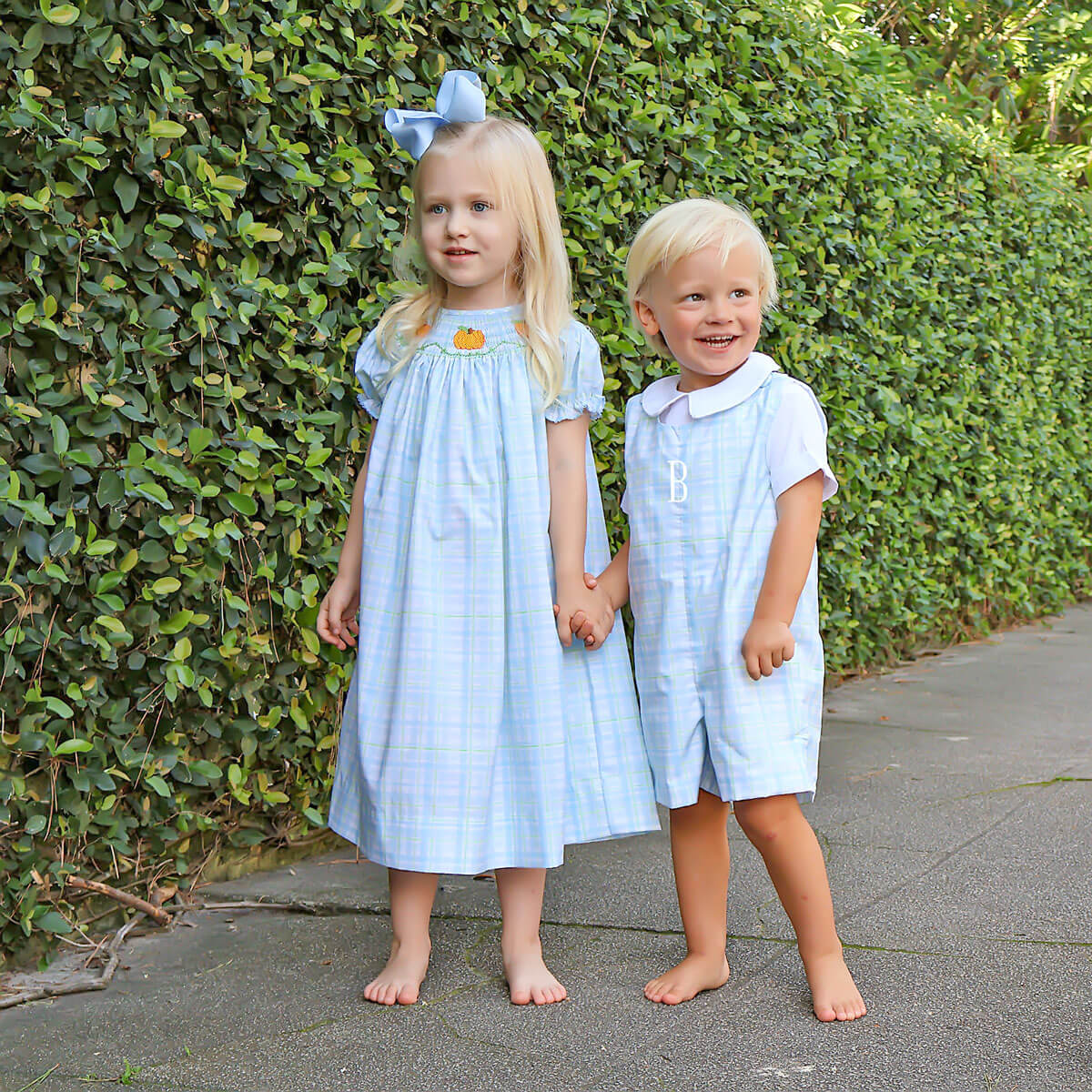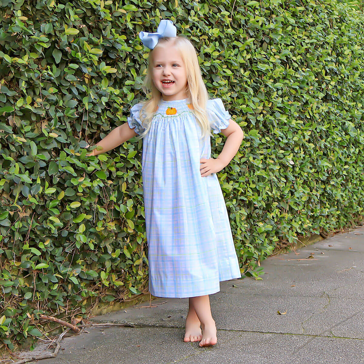 Get into the fall spirit with our Pumpkin Smocked Blue & Green Plaid Bishop Dress! This charming dress in blue and green plaid, featuring bishop sleeves, is perfect for all your autumn outings. It has adorable smocked pumpkins that add a whimsical touch to every fall adventure.