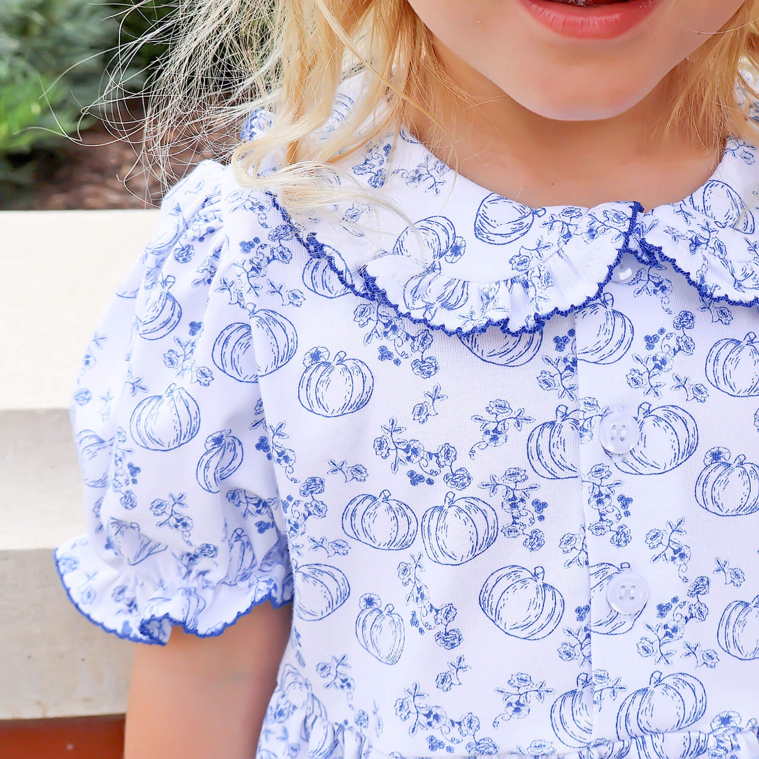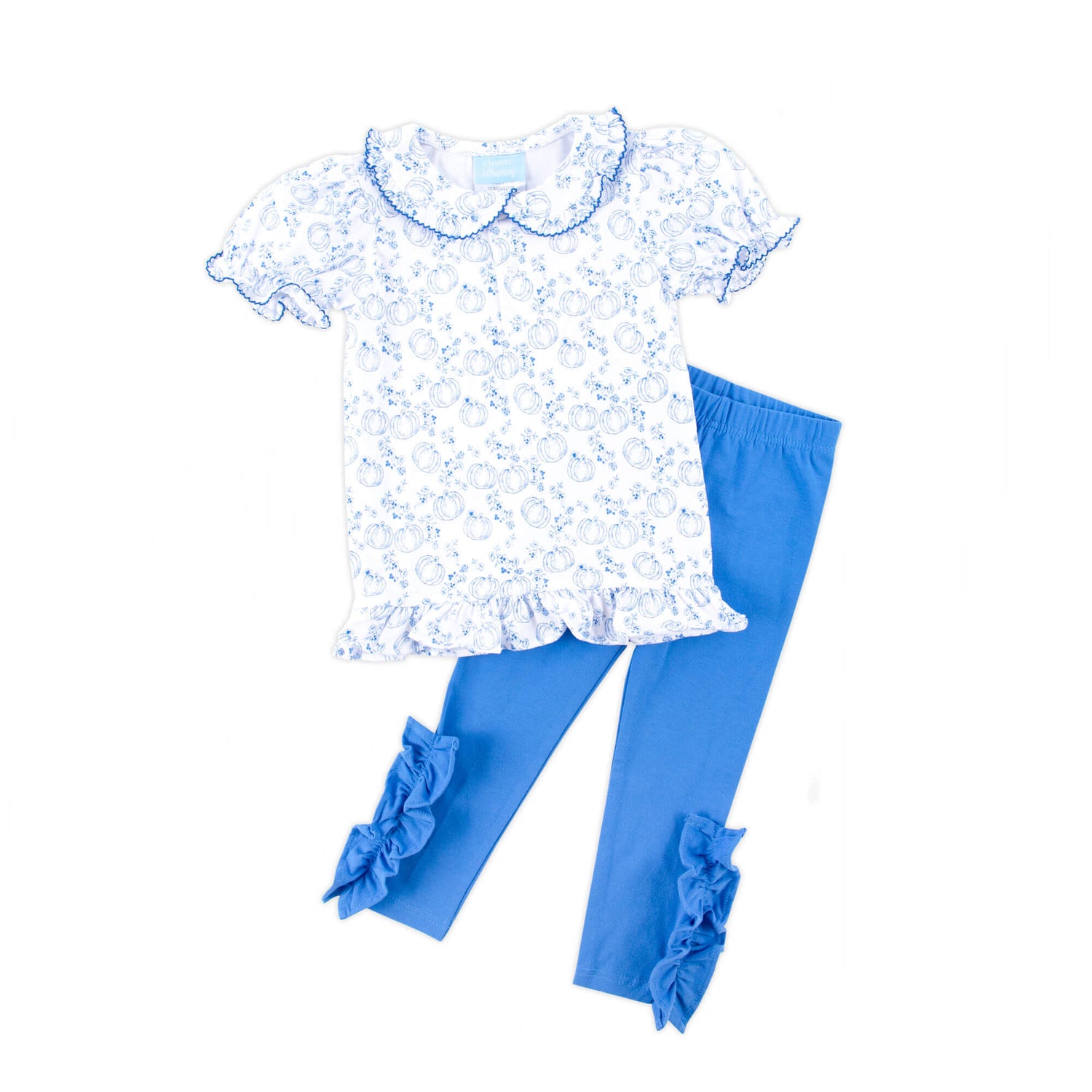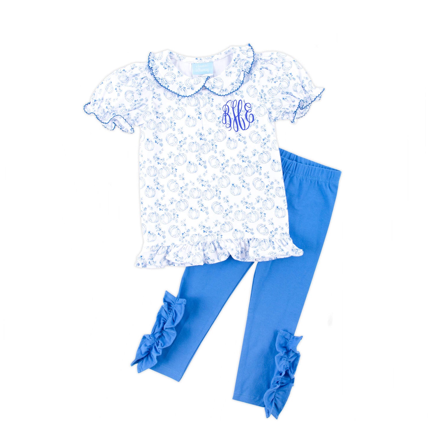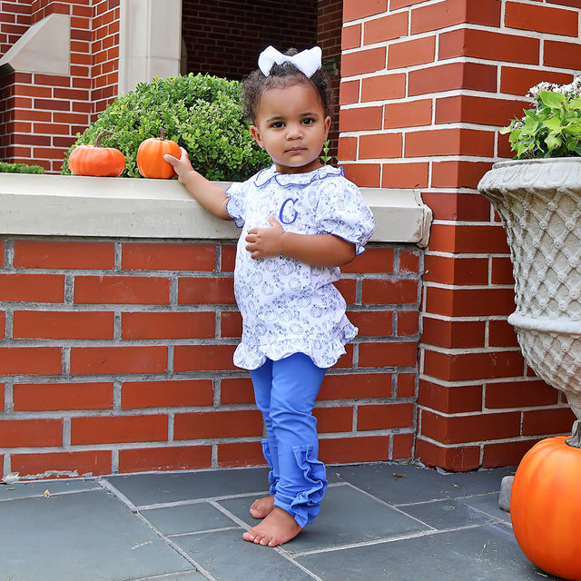 Get your little one ready for fall with our adorable Pumpkin Blue Toile Gwen Legging Set! The Gwen-style top features a delightful custom blue pumpkin toile print, and sweet ruffle details on the bishop sleeves and collar with blue picot trim. Coordinated with blue leggings, making it perfect for the season's festivities. Add a monogram for a personalized touch!