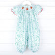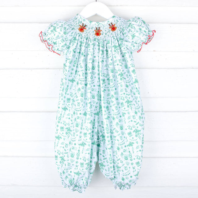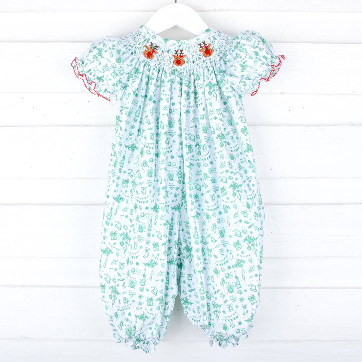 Reindeer Cheer Smocked Green Toile Long Bubble