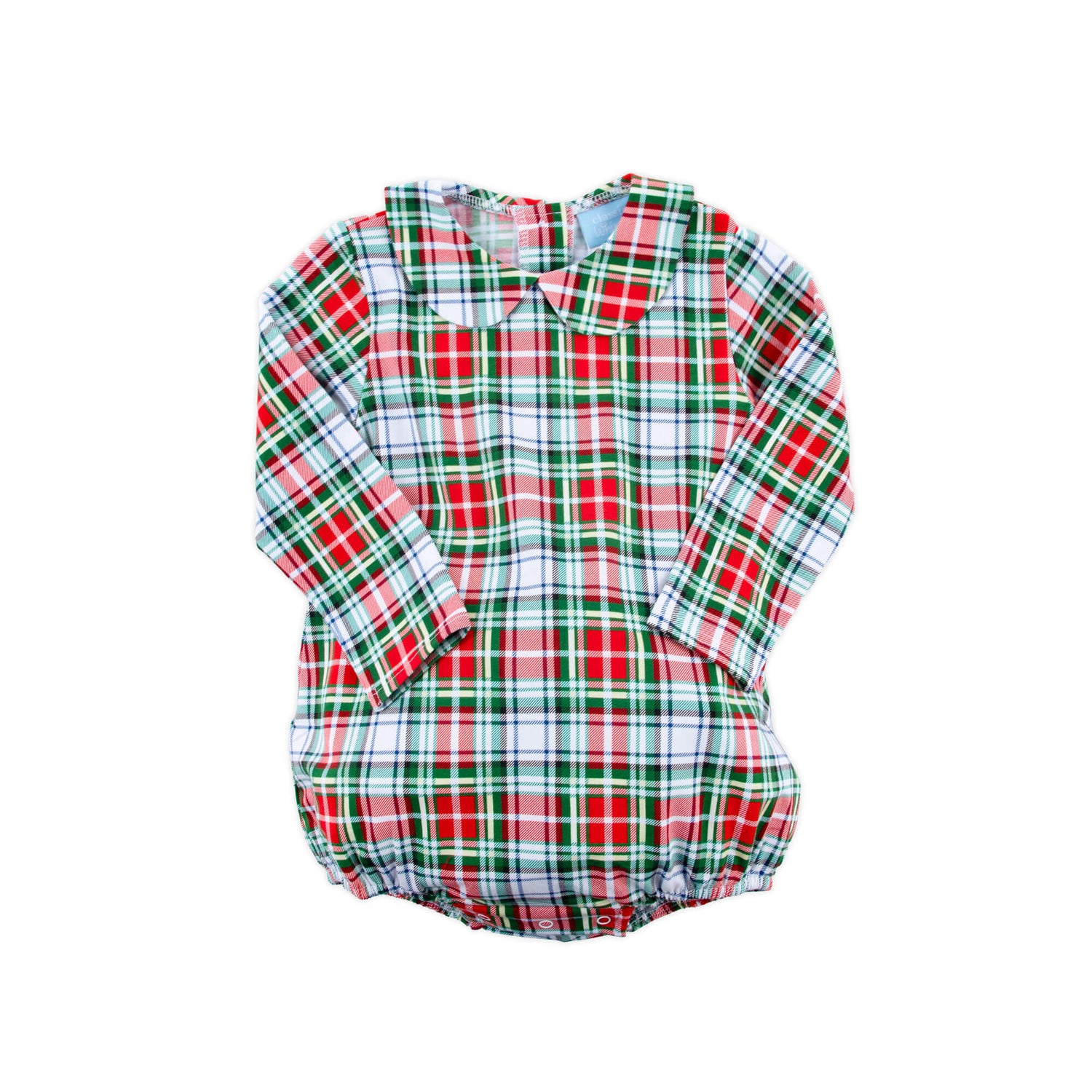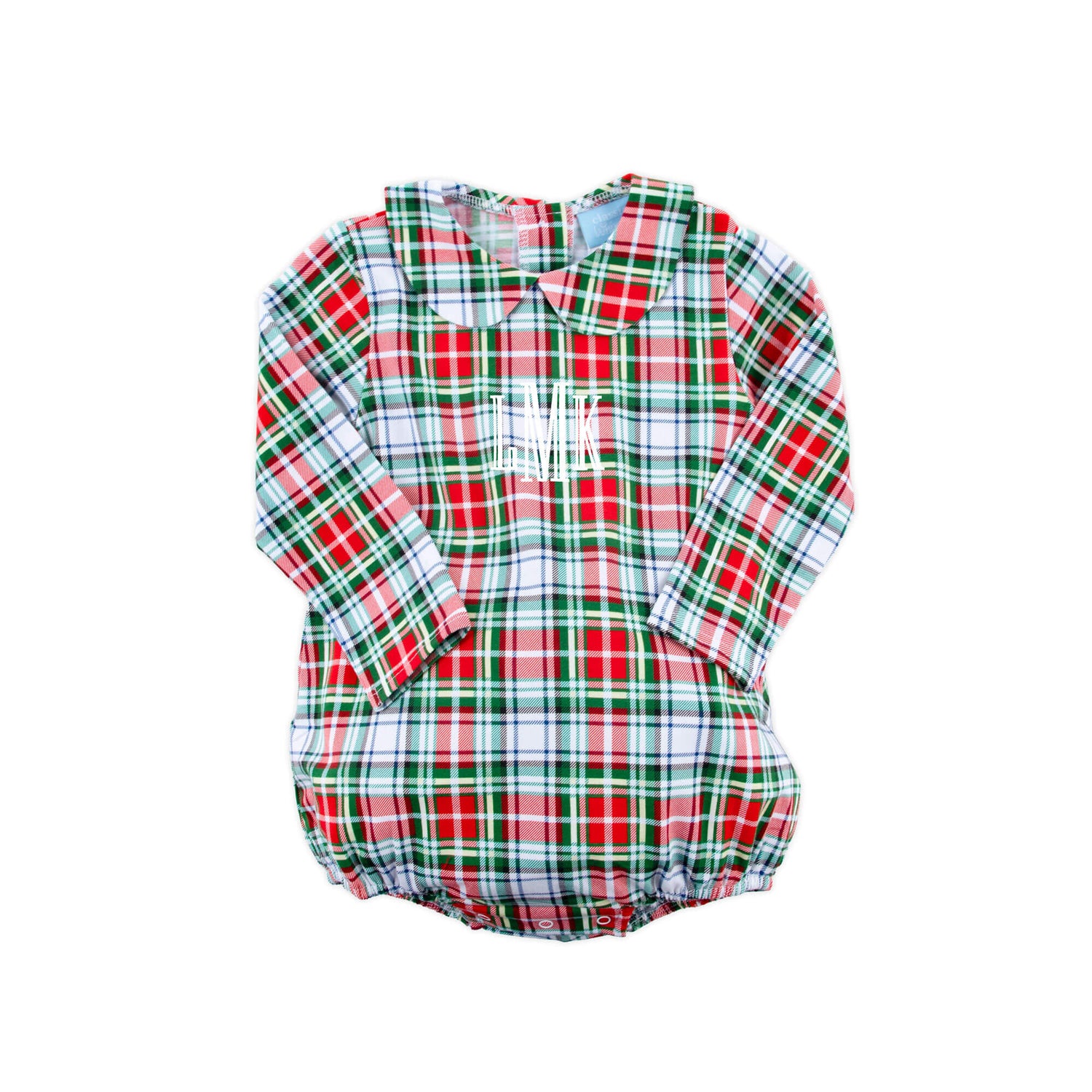 Get ready for the holidays with our Sinclair Plaid Collared Bubble! This festive Sinclair knit plaid bubble features a sweet collar and long sleeves, ensuring holiday style. With convenient snaps at the stride, it’s both adorable and practical. Add a monogram for a personalized holiday touch.