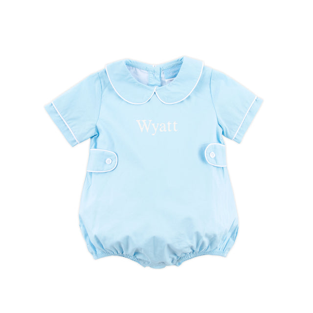 Introducing our timeless Solid Light Blue Collared Bubble, a versatile and classic outfit perfect for any occasion or holiday celebration. With its crisp light blue fabric and charming collar and side tabs, this simple yet elegant piece is a must have in every little one’s wardrobe. Designed with convenient snaps in the stride, it combines style and comfort effortlessly. Make it uniquely theirs by adding a monogram for a personalized touch that elevates its charm.