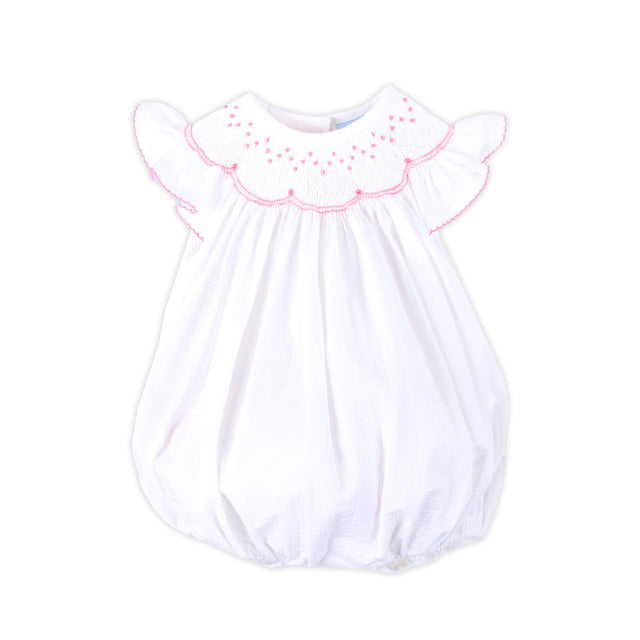 Your little sweetie will be all smiles in our Geo Smocked White Seersucker Angel Sleeve Bubble! This darling bubble features geometric smocking and fluttery sleeves with pink picot trim for the perfect touch of charm. Made for twirling through sunny days and sweet celebrations! Snaps in stride for easy changes.
