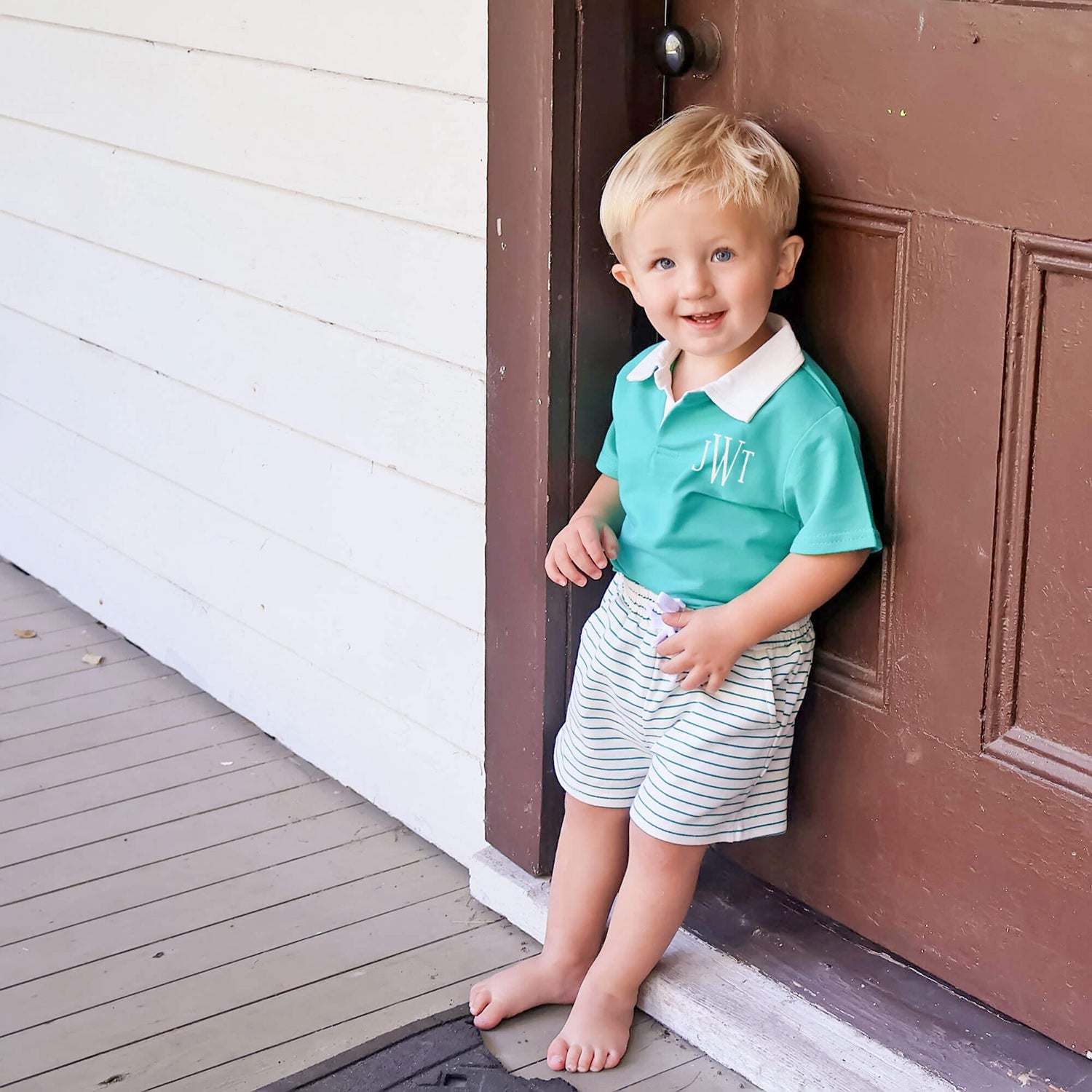 Celebrate summer in style with our Green Terry Polo Short Set! This soft green French terry polo pairs perfectly with matching green stripe French terry waistband shorts. Perfect for sunny adventures or your next resort getaway! Add a monogram to make it uniquely theirs.