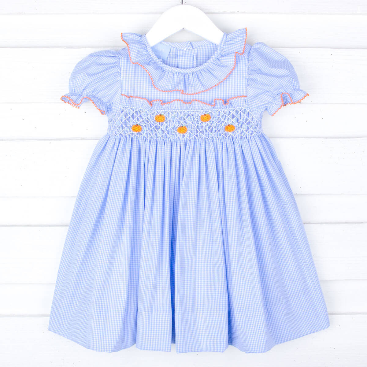 Harvest Pumpkin Light Blue Gingham Smocked Ruffle Collar Dress