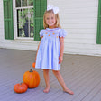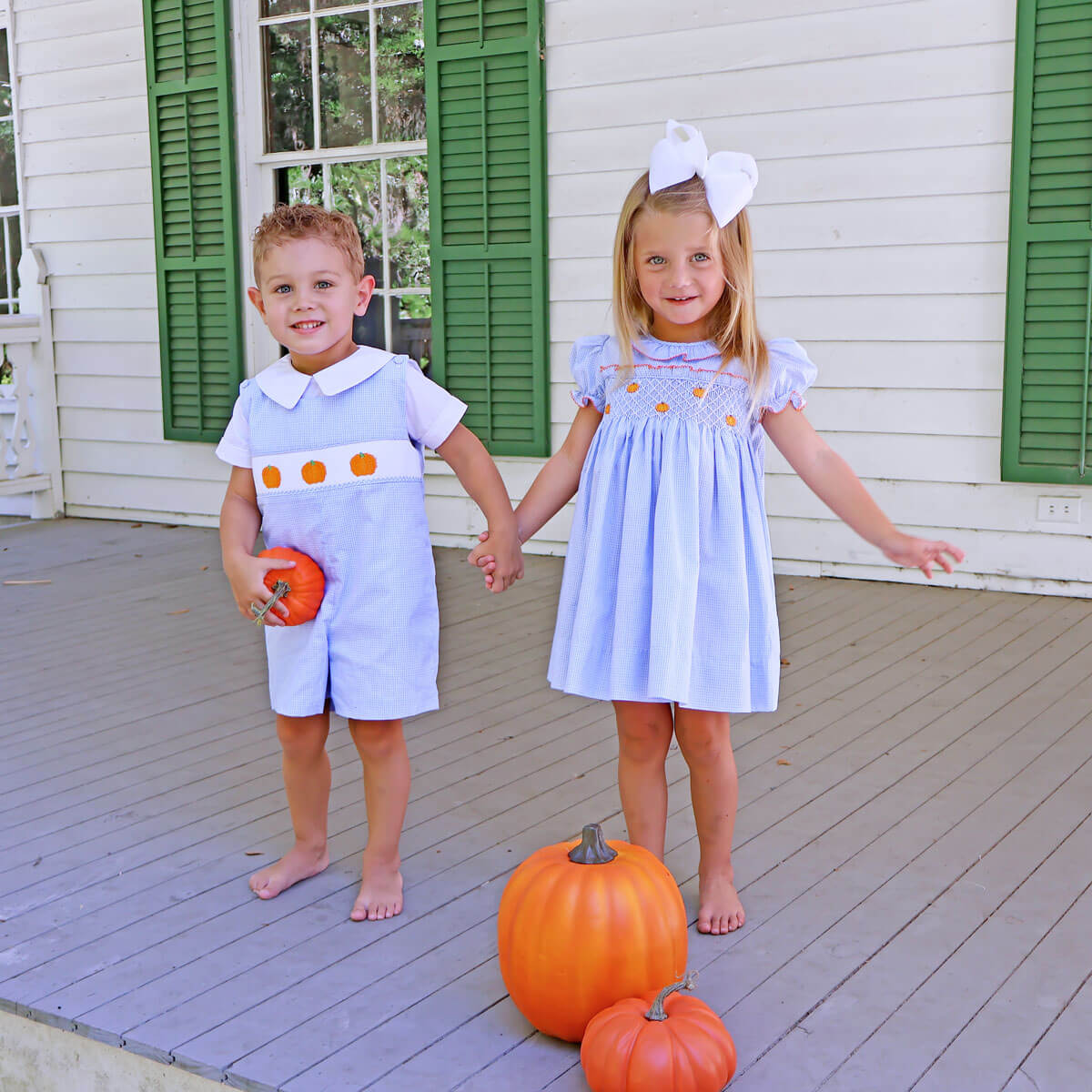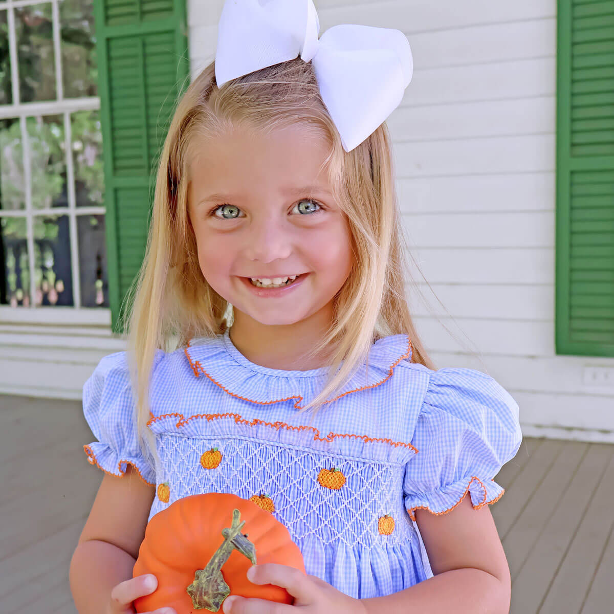 Get into the fall spirit with our Harvest Pumpkin Light Blue Gingham Smocked Ruffle Collar Dress! This charming light blue gingham dress is perfect for all your autumn outings. It features a sweet ruffle collar and adorable tiny smocked pumpkins that add a touch of whimsy to every fall adventure.