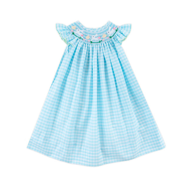 Get your little one excited to celebrate Easter in the Hippity Hop Smocked Dress. This turquoise gingham dress features the sweetest smocked bunnies adorned with flowers and Easter eggs. Complete with adorable flutter sleeves and light yellow picot trim, it's a charming outfit for the occasion.