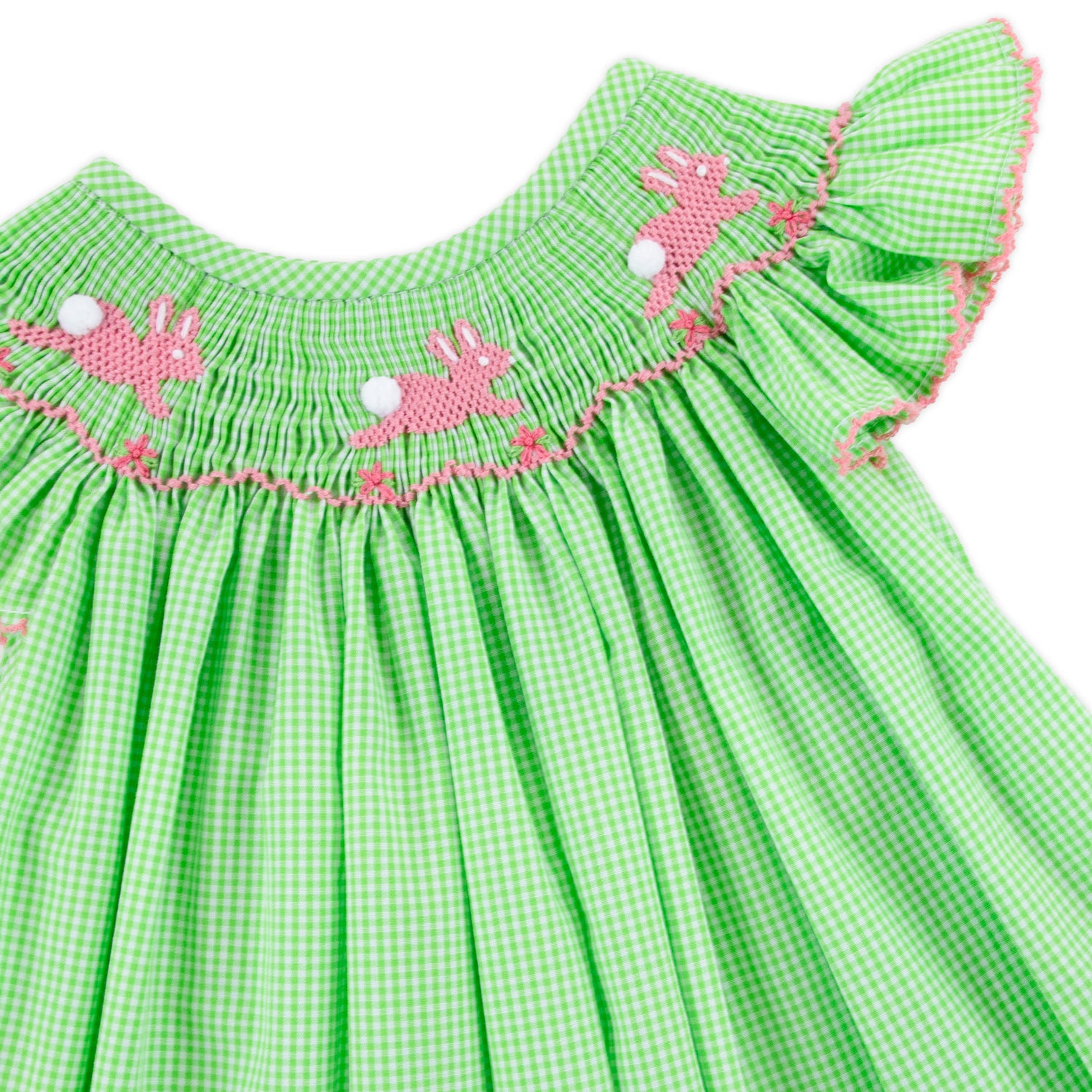 Celebrate Easter in sweet style with our Hop To It Smocked Dress. This vibrant green gingham dress features adorable smocked pink bunnies and dainty flutter sleeves trimmed with pink picot for an extra touch of charm. Perfect for a joyful Easter celebration, this dress will make your little girl shine on this special day.