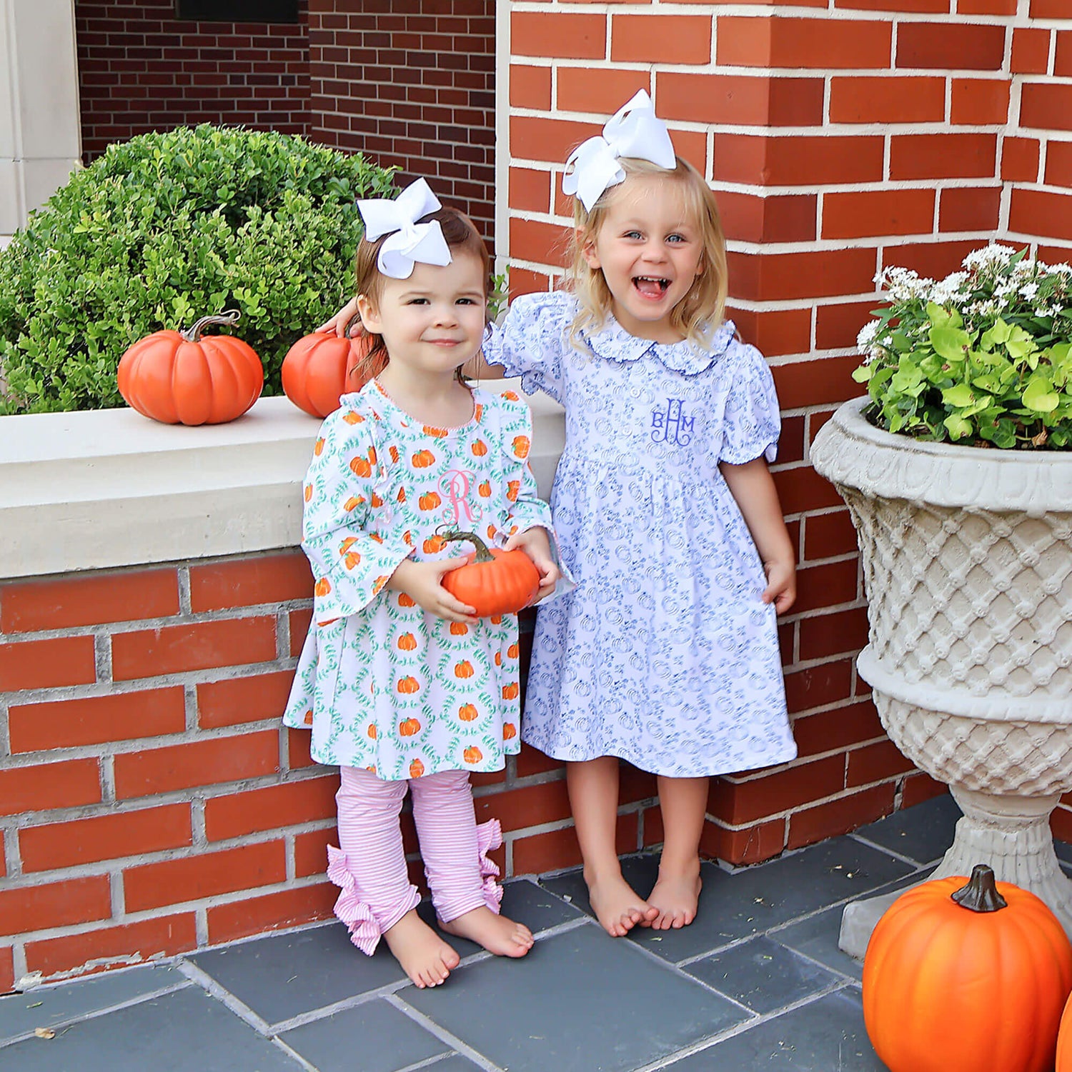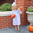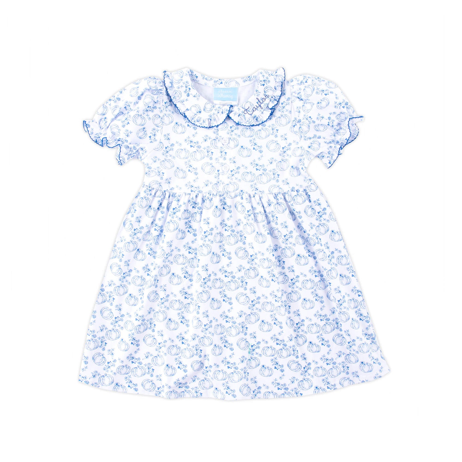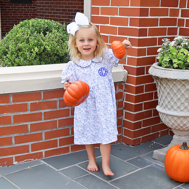 Get your little one ready for fall with our adorable Pumpkin Blue Toile Gwen Dress! This charming dress features a delightful custom blue pumpkin toile print, and sweet ruffle details on the bishop sleeves and collar with blue picot trim, making it perfect for the season's festivities. Add a monogram for a personalized touch!