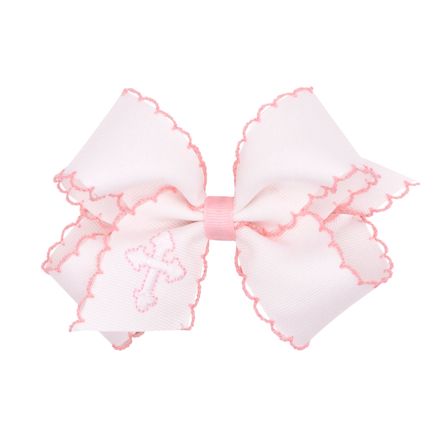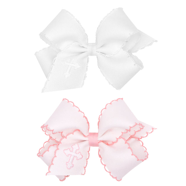 Embroidered cross on a white grosgrain white bow and moonstitch detail. This alligator clip bow is perfect for Easter or Baptism!