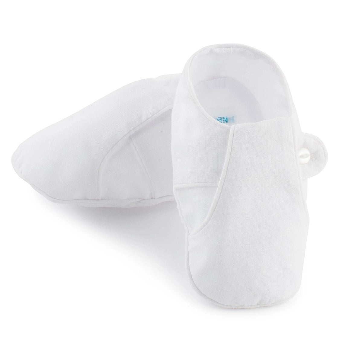 A beautiful and classy pair of baby booties for your precious little boy! These booties are the perfect match to just about anything he wears, with their refined blue and white colors and dainty style. Made with a T-strap fastened with a cute little button, these booties are both sophisticated and sweet.