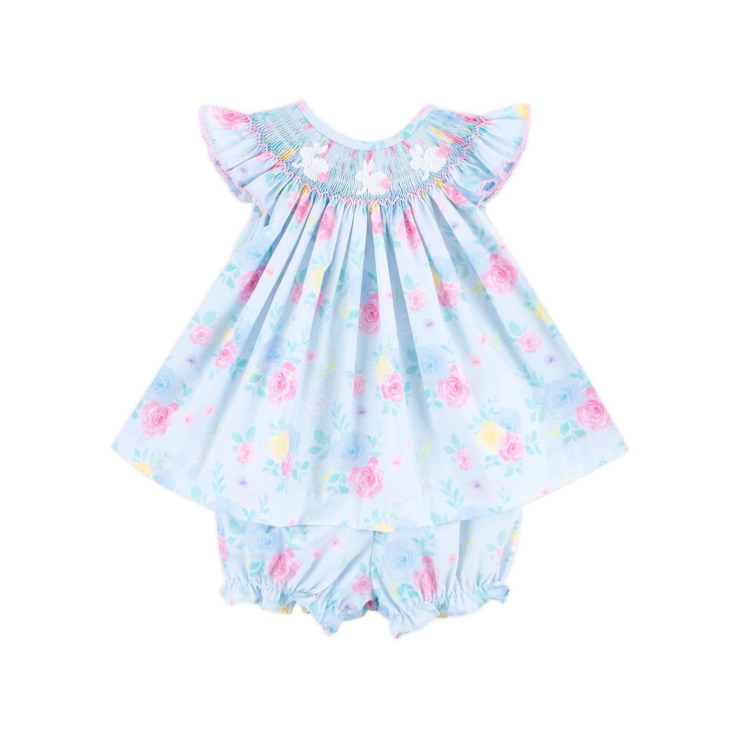 Celebrate Easter in our darling Bunny Smocked Turquoise Angel Sleeve Bloomer Set! This charming turquoise top with a rose floral print features hand-smocked pink bunnies and fluttery angel sleeves trimmed with pink picot. It’s perfectly coordinated with matching floral bloomers, making it ideal for springtime sweetness.