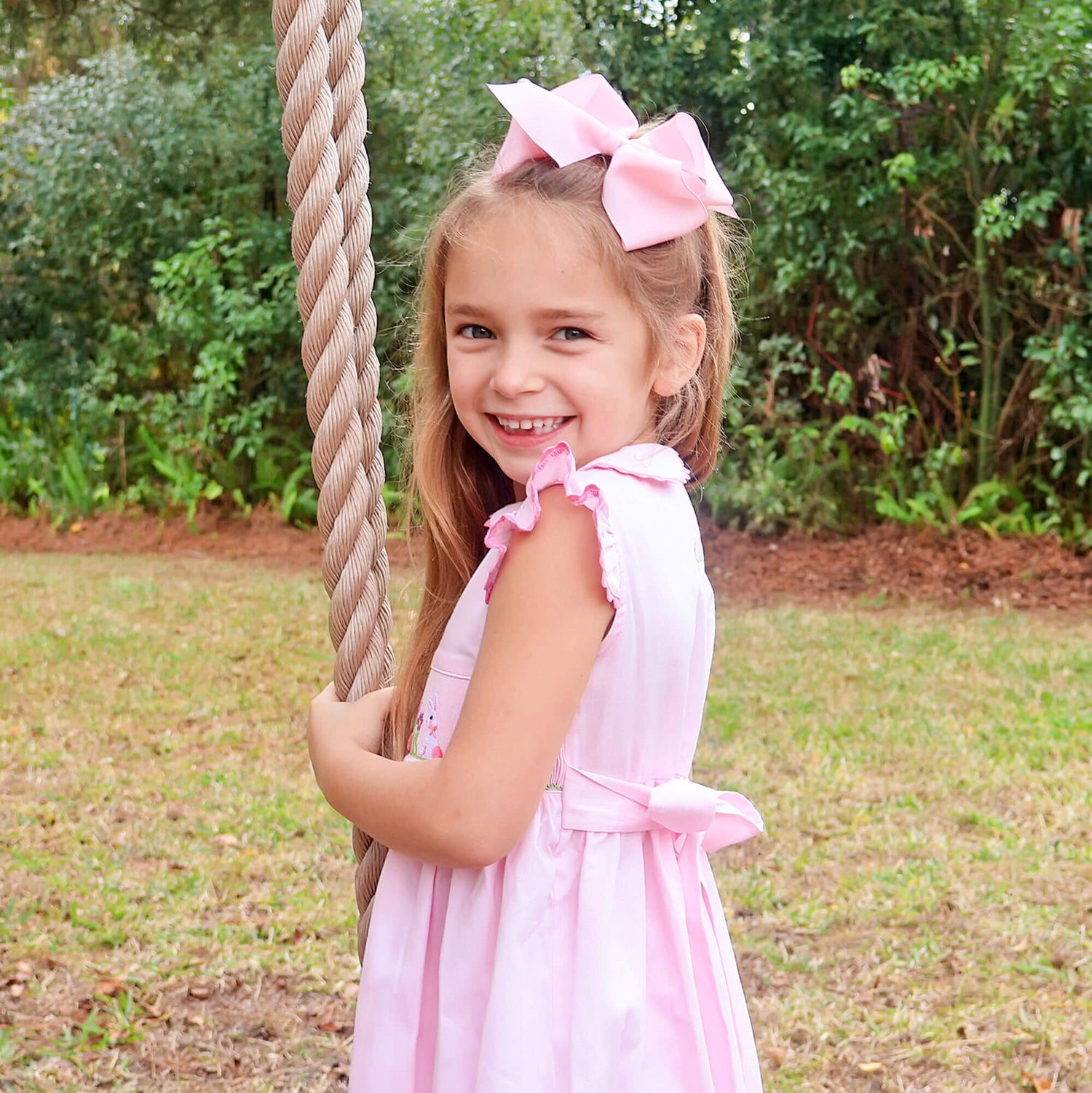 Celebrate Easter Sunday in our Easter Celebration Pink Piqué Smocked Collared Dress! This darling pink piqué dress features a sweet collar trimmed with pink ric-rac, flutter sleeves, and precious smocked Easter bunnies.