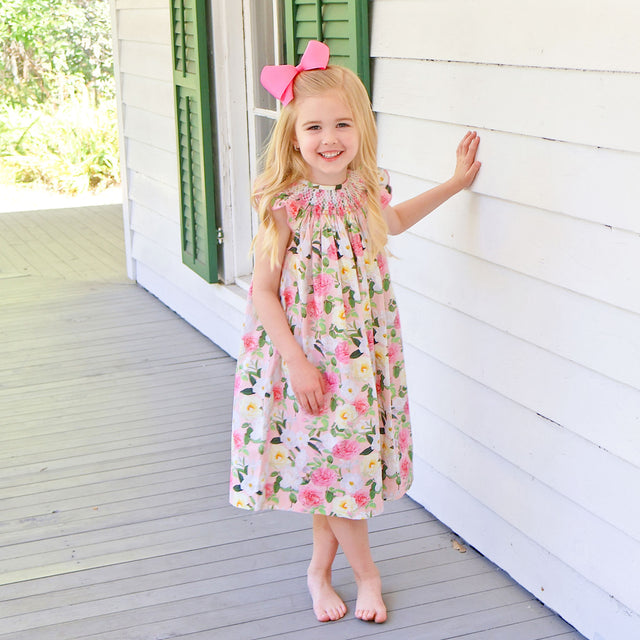 Spring is blooming, and so is this Everbloom Floral Smocked Angel Sleeve Dress. This pink floral print dress features angel flutter sleeves and delicate geometric smocking for a charming springtime look.