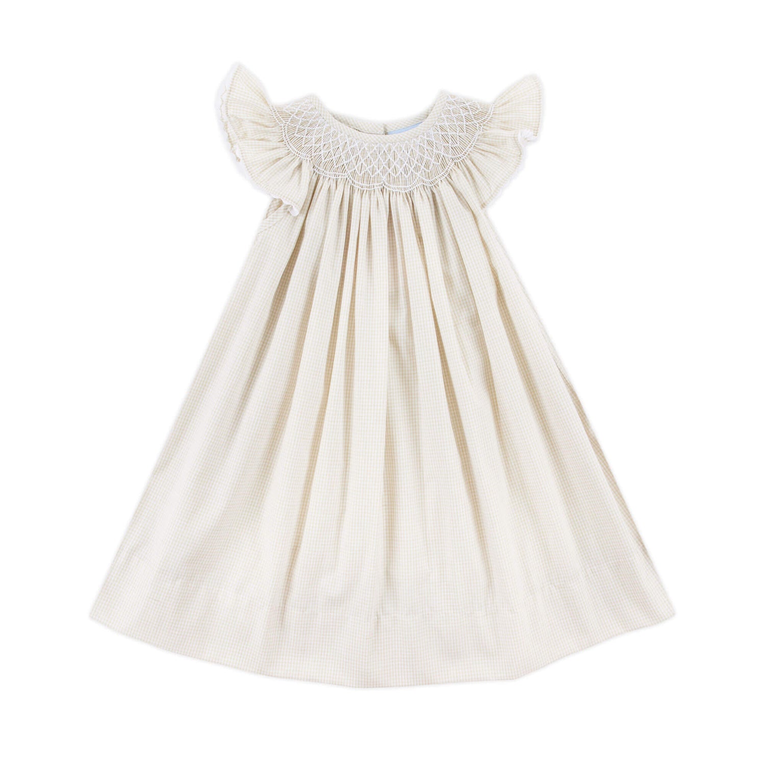 The Geo Smocked Tan Gingham Angel Sleeve Dress is a timeless choice for family beach portraits and warm-weather gatherings. Featuring classic tan gingham, elegant geometric smocking, and flutter angel sleeves finished with white ric-rac trim, this darling style blends coastal charm with traditional detail.