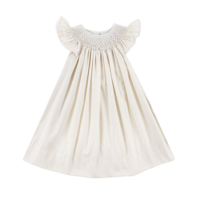 Geo Smocked Tan Gingham Angel Sleeve Dress