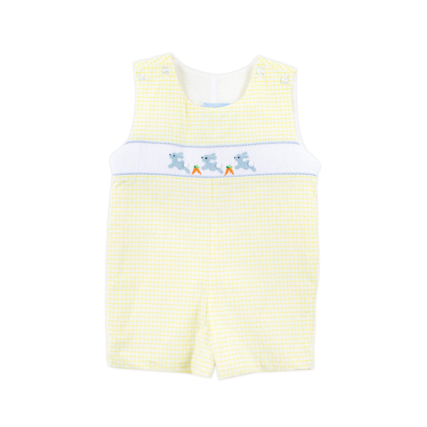 The Hoppy Bunnies Smocked Jon Jon is an ideal pick for Easter egg hunts. Adorned in cheerful yellow windowpane, this Jon Jon features charming smocked hopping bunnies. Designed for convenience, it features shoulder buttons and snaps in stride, making it a delightful and practical outfit choice for celebrating Easter festivities.