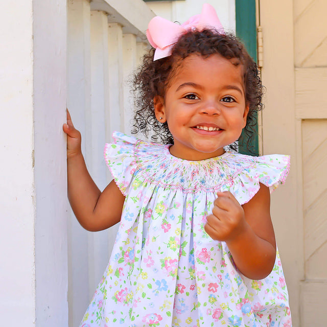 Isn't the Majorelle Garden Smocked Angel Sleeve Dress just darling? This floral print dress features geometric smocking and flutter sleeves adorned with pink picot trim.
