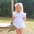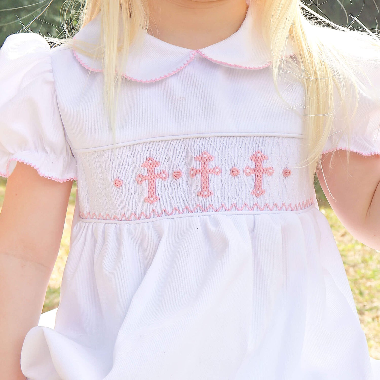 With this Pink Cross Smocked White Pique Collared Bubble, your little angel will look absolutely stunning on her Christening Day or any special church event! This white piqué bubble features hand-smocked pink crosses, a scalloped collar, bishop sleeves, and a sash tie for the sweetest finishing touch. Snaps in stride for easy changes.