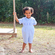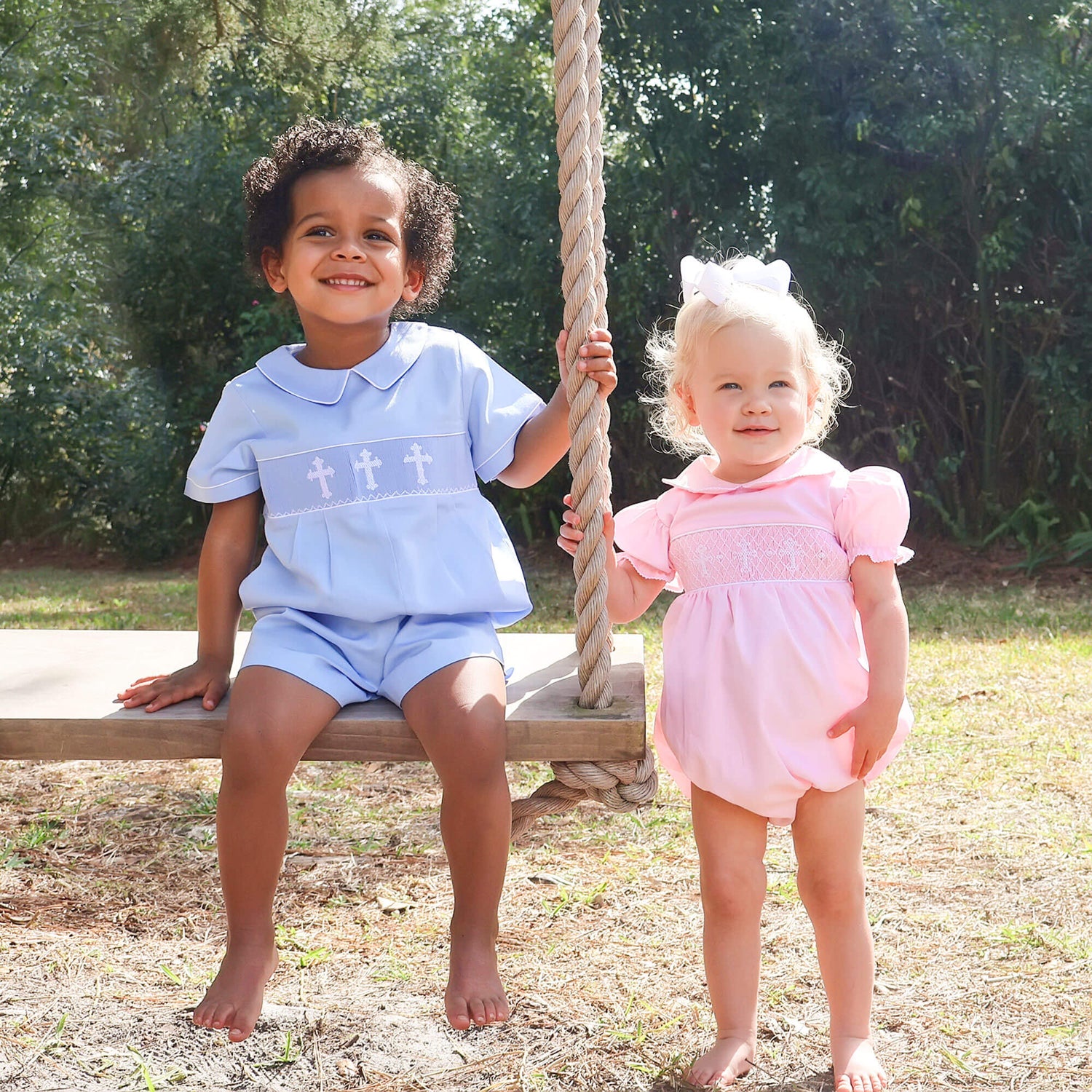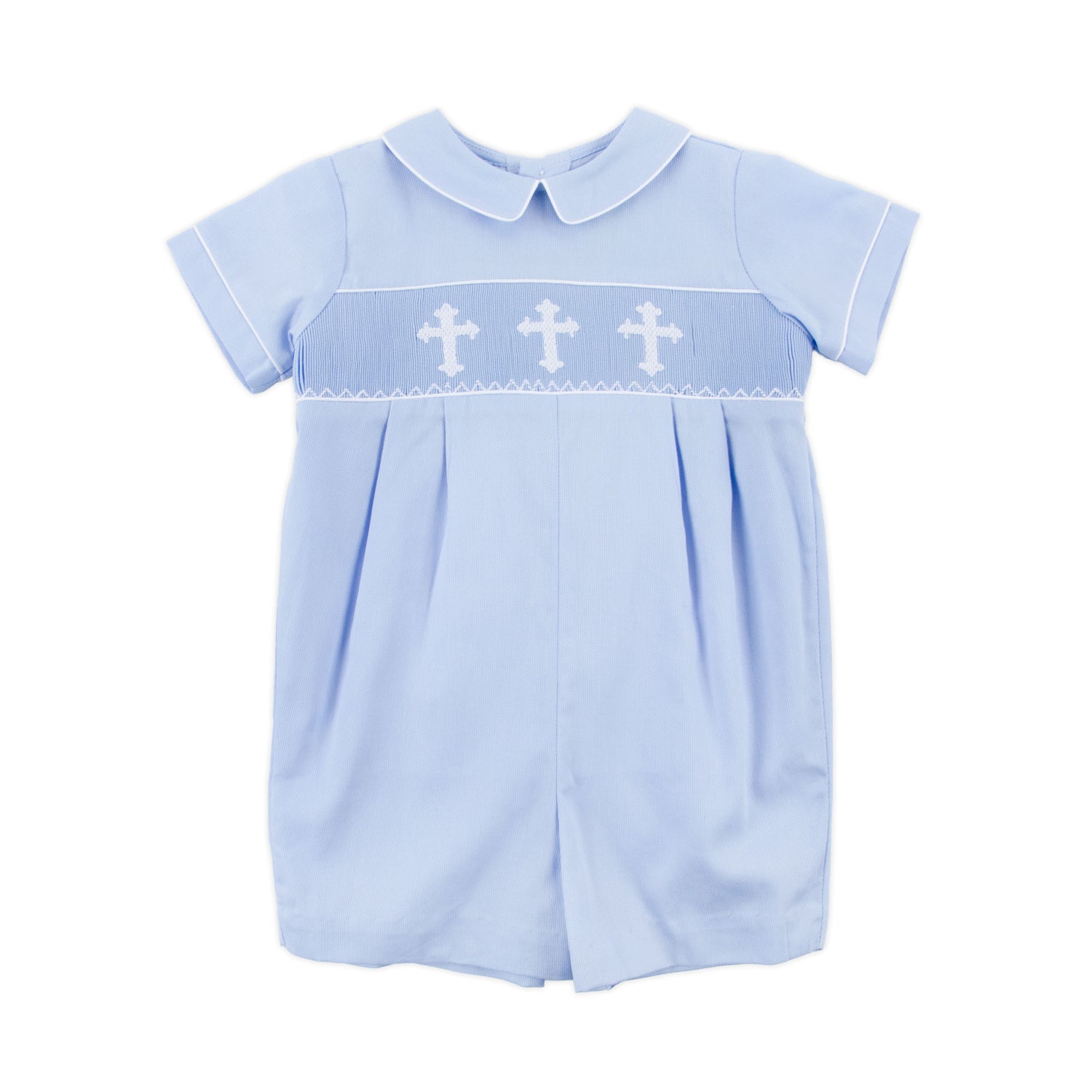 Your little guy will look precious on his Christening Day or any church events! Features hand-smocked white crosses on solid light blue pique fabric. Also features a cute collar with white piping. Snaps in stride.