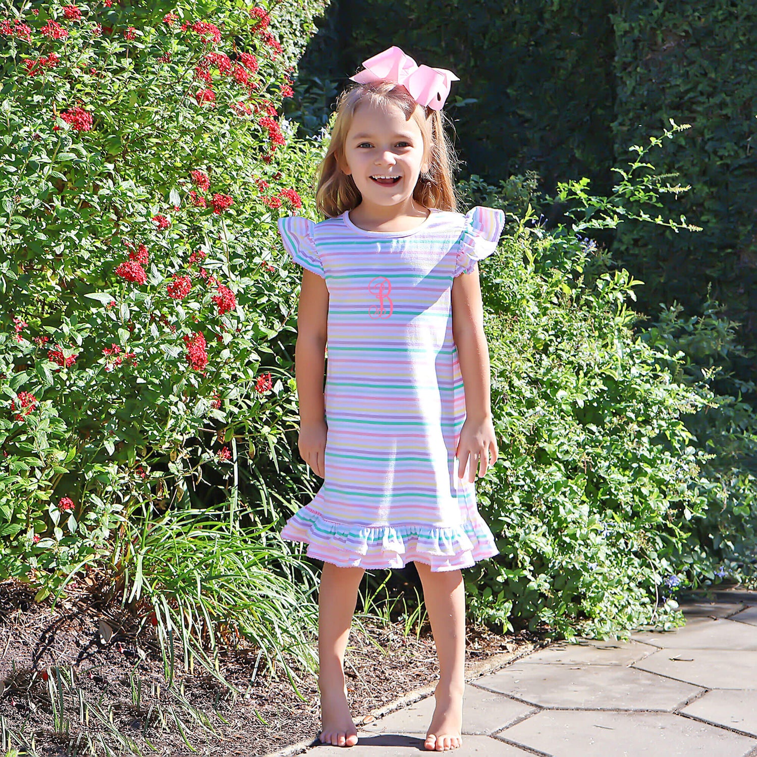 Your little one will be ready for Easter fun in this Pastel Pink Stripe Milly Dress! This sweet knit dress features multi-colored soft pastel stripes and charming ruffle details, perfect for celebrating the season. Add a monogram to make it an extra special Spring outfit!