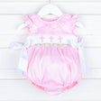 Beautiful Pink Cross and Vine Smocked Beverly Bubble. Features hand-smocked pink crosses, side bows, ruffle collar, and snap in stride. Perfect for Christenings or Easter!