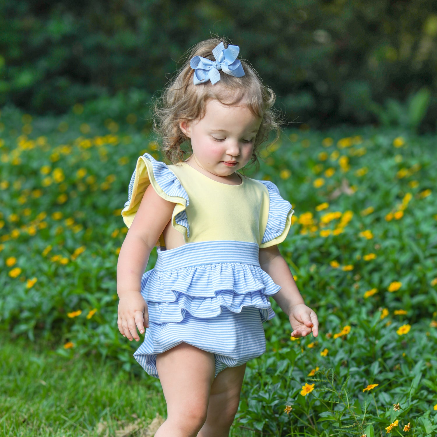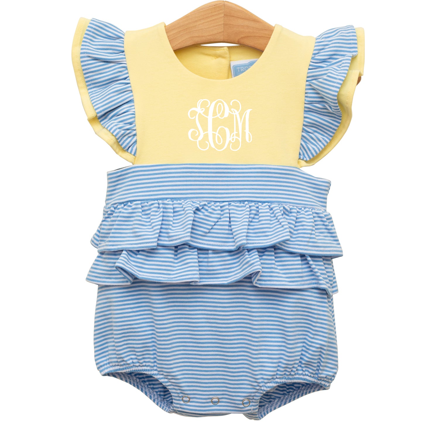 The Rosie Cornflower and Yellow Bubble is perfect for any occasion! The cornflower and yellow knit bubble features a playful waterfall ruffle detail for a sweet look that's ready for playtime fun. Snaps in stride for easy changes. Add a monogram to personalize this adorable outfit!
