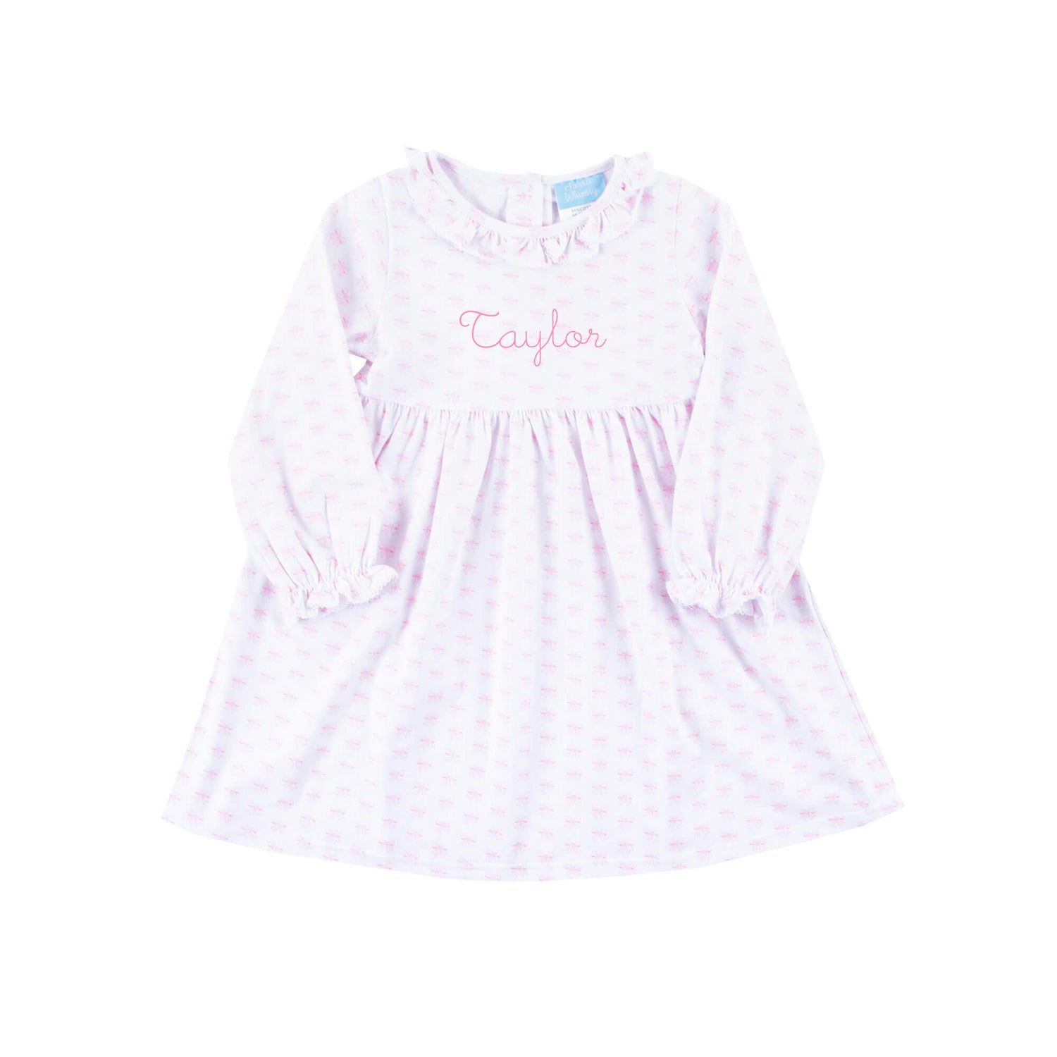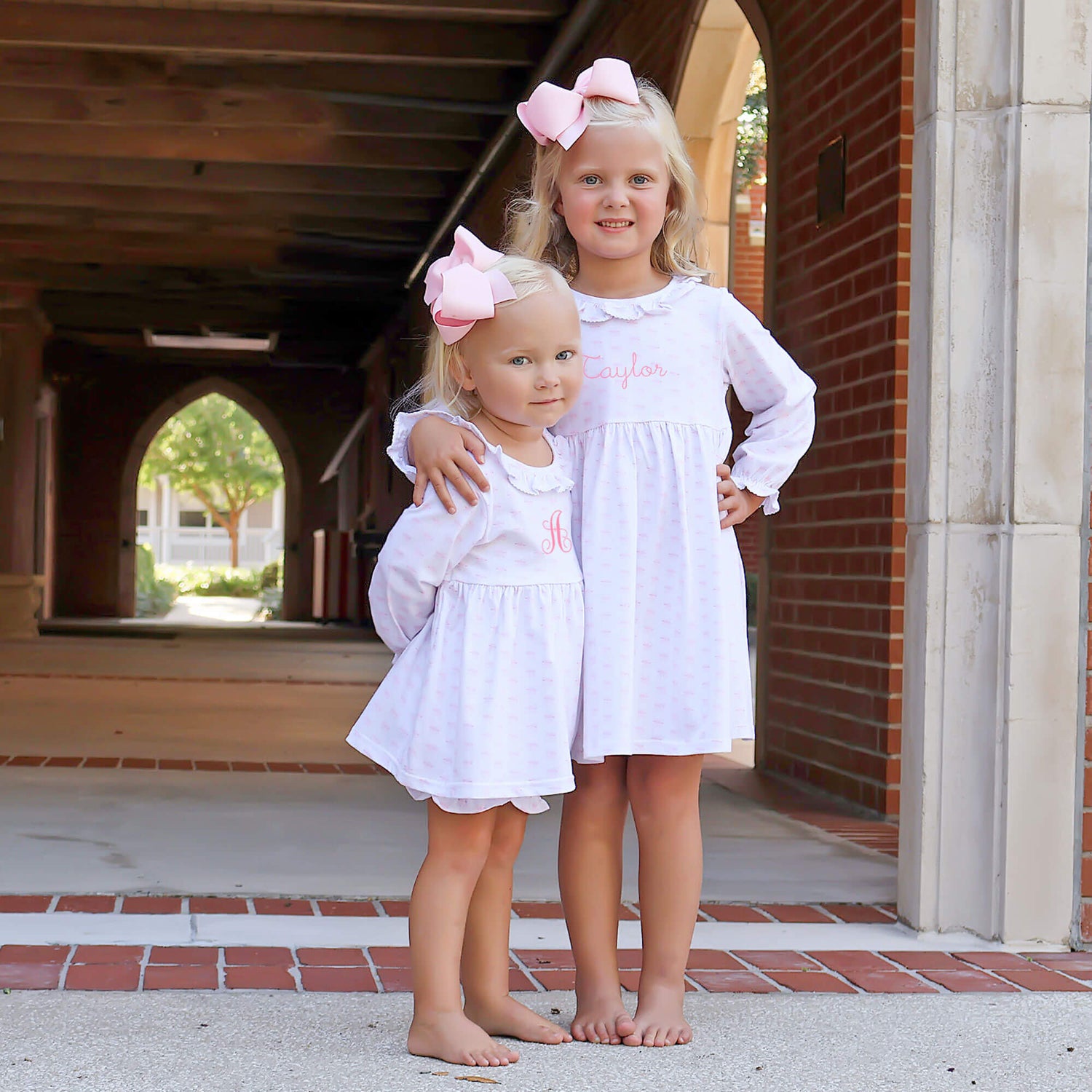 Your little girl will adore wearing the Bow Print Riley Dress! The Eden-style dress, designed in a pink bow knit print, features a charming collar with picot trim, and long bishop sleeves. Add a monogram for an extra-special touch. It's the perfect dress for any sweet adventure!