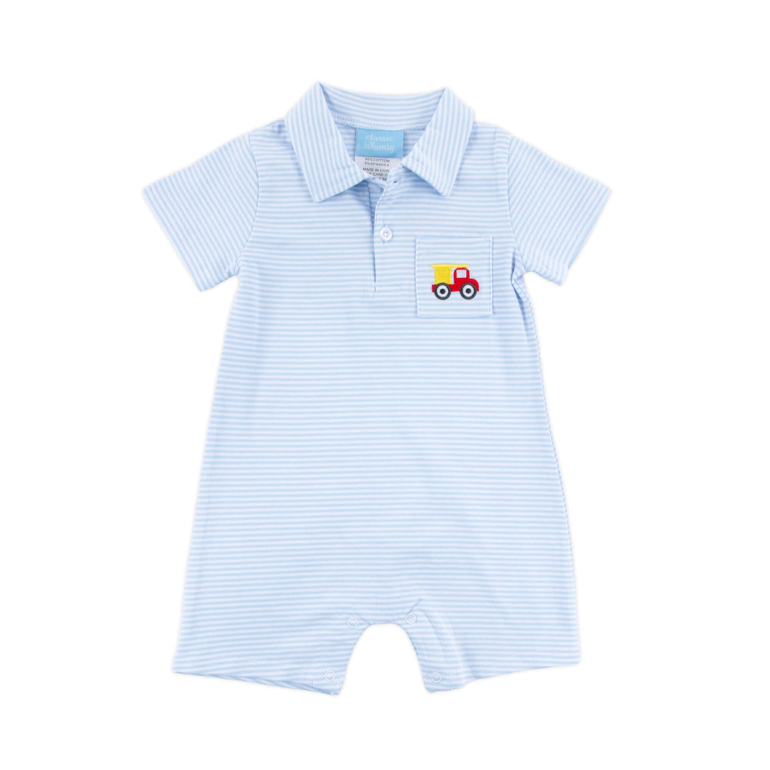 This Dump Truck Light Blue Stripe Polo Romper is perfect for playtime and everyday adventures. Designed in a soft light blue stripe knit, this sweet romper features an embroidered dump truck for a playful touch. Snaps in stride make changes quick and easy. Add a monogram to make this outfit feel extra special.