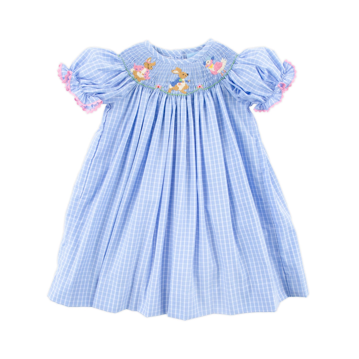 Get ready for Easter with our Storybook Smocked Blue Windowpane Dress. This charming blue windowpane dress brings characters from our favorite books to life with smocked bunnies and ducks. The adorable bishop sleeves adorned with pink ric-rac trim add a sweet touch.