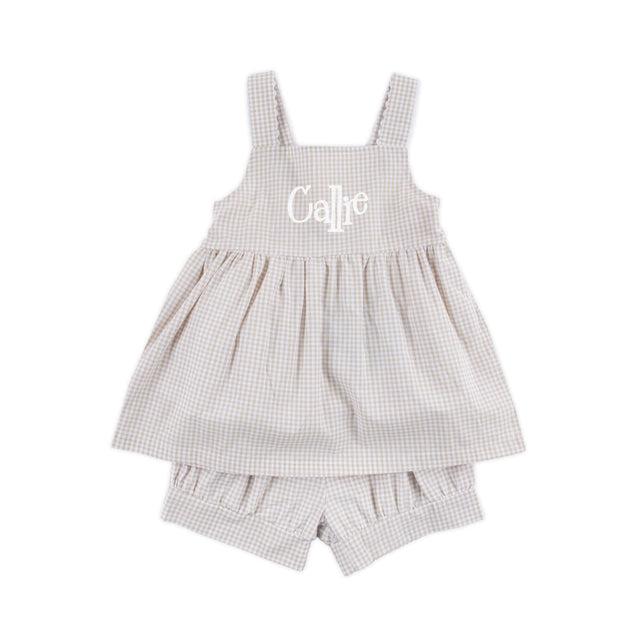 Celebrate summer in our charming Khaki Gingham Mia Short Set, a sweet choice for warm weather days and beachside family pictures. The Mia style top features classic khaki gingham with cross back straps for an extra touch of charm. Coordinated with matching gingham shorts, this set is perfect for sunny outings and special moments. Add a monogram to make this outfit feel even more special.
