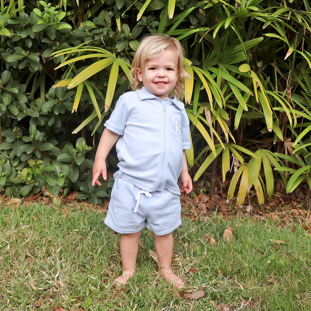 This Light Blue Terry Swim Cover Up Short Set is perfect for sunny summer days and resort vacations. The set features a light blue terry zip up shirt with a side pocket, paired with drawstring shorts for an easy and comfortable look. Ideal for poolside lounging, beach days, or throwing on after a swim.